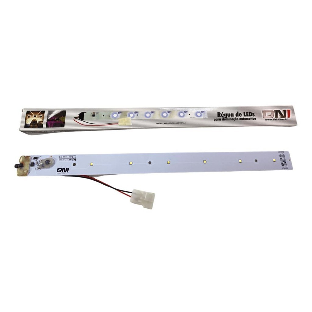 Régua de Leds Automotiva 12/24V - 6 Leds SMD<br><br>- Tensão de Funcionamento: 12/24Vdc<br><br>- Potência Máxima: 6 Watts<br><br>- Corrente: 0,250mA<br><br>- 6 Leds de alto brilho, luz branca<br><br>- Intensidade de Iluminação: 100 lx<br><br>- Temperatura de Cor: 6000k<br><br>- Vida útil aproximada do Led: 50.000h<br><br>- Baixo consumo com alta eficiência<br><br>- Produzido com tecnologia SMD<br><br>- Com plug que facilita a instalação<br><br>- Possui 3 furos de Ø4mm para fixação;<br><br>- Não utiliza reator, facil instalação<br><br>- Ideal para iluminação interna em: ônibus, caminhões, baús, vans, trailers, embarcações e outros<br><br>- Dimensões Aproximadas. : 40 x 3 cm