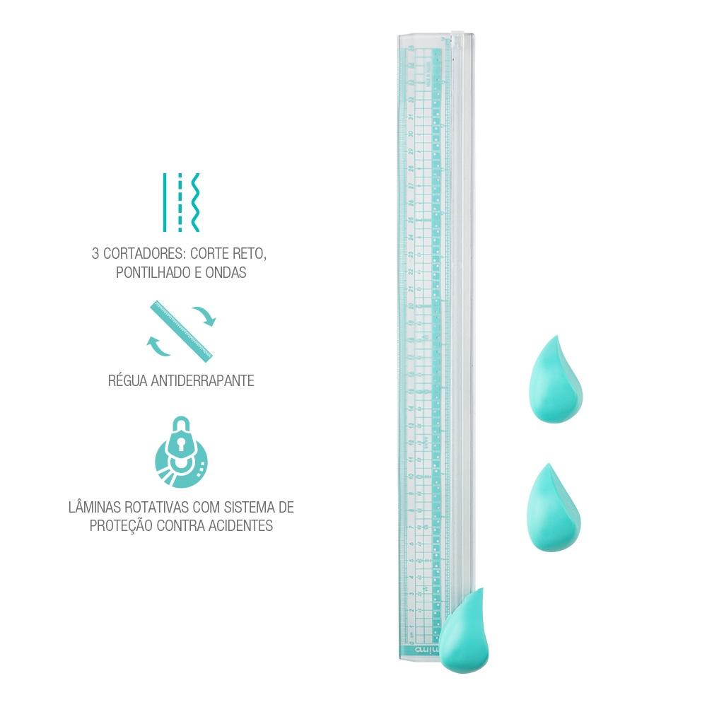 Régua com Cortador 3 em 1 Mimo A Régua com Cortador 3 em 1 Mimo possui três diferentes cortadores rotativos que fazem cortes retos, pontilhados e em ondas. Além disso, ela é antiderrapante e tem 35 cm com escala de medição em centímetros e em polegadas, horizontais e verticais. Tudo isso gera maior precisão do corte. Ela é recomendada para cortar uma folha por vez de diversos papéis com gramatura de até 300 g/m², tais como papel fotográfico, papel cartão, sulfite. Também é possível cortar vinil adesivo. As lâminas rotativas dessa régua vêm com um sistema de molas que mantém a lâmina automaticamente dentro do cortador quando não está em uso, evitando possíveis acidentes com o produto. Essa Régua com Trimmer Mimo ajuda na produção de vários tipos de artesanato, como de scrapfesta, scrapbook, papercraft low poly, encadernação, convites, home decor, cartões de visitas, papelaria empresarial, tags e muito mais. Refil de Cortadores para Régua 3 em 1 Mimo Caso você já tenha a Régua com Cortador 3 em 1 Mimo, mas precise trocar ou repor um dos cortadores, basta comprar os refis vendidos separadamente. Informações Técnicas: Produto: Régua com Cortador 3 em 1 Mimo - 35 cm Cor: Transparente e Azul Água Quantidade: 4 Peças Tipo de Cortadores: Rotativo Padrões de Corte dos Cortadores: Reto, Pontilhado e Ondas Tipos de Papéis Recomendados: uma folha por vez de papéis com gramatura de até 300 g/m², como papel fotográfico, papel cartão e sulfite Tamanho: 35 cm Escala de Medição: Em centímetros e em polegadas, horizontais e verticais Marca: Mimo Crafts Código de Fábrica (SKU): 05969