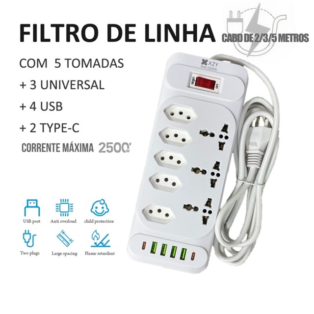 Filtro de Linha com 8 Tomadas:5 Tomadas + 3 Tomadas Internacionais + 4 Portas USB + 2 Portas Tipo-C 2/3/5 Metros 🌀 Descrição do Produto: Transforme a maneira como você conecta e carrega seus dispositivos com nosso filtro de linha versátil e moderno, projetado para oferecer conveniência, segurança e organização em um único acessório. 📏 Características Principais: - Comprimento do Cabo: 2/3/5 metros, proporcionando flexibilidade para alcançar tomadas distantes e organizar seus dispositivos de maneira prática. - 🔌 Tomadas Padrão: 5 tomadas regulares para conectar diversos aparelhos elétricos simultaneamente. - 🌍 Tomadas Internacionais: 3 entradas internacionais que suportam diferentes tipos de plugs, ideal para carregar dispositivos de visitantes ou gadgets adquiridos fora do país. - ⚡ Portas USB: 4 portas USB (5V/2A cada) para carregamento direto de smartphones, tablets e outros dispositivos, eliminando a necessidade de adaptadores. - 🔋 Portas Tipo-C: 2 portas Tipo-C (5V/2A) para carregamento rápido de dispositivos modernos, como smartphones e tablets que utilizam essa tecnologia. 🛡️ Funcionalidades Adicionais: - Proteção Contra Sobrecargas: Sistema de proteção contra surtos de energia e picos de tensão, garantindo a segurança dos seus aparelhos eletrônicos. - 🔘 Chave de Liga/Desliga: Botão integrado para desligar todas as tomadas e portas USB ao mesmo tempo, aumentando a segurança e economizando energia. - 💡 Indicador de Energia: Luz LED que indica o funcionamento do filtro de linha e mostra quando o dispositivo está ligado corretamente. - 🏠 Design Compacto e Moderno: Ideal para diferentes ambientes, seja em casa, no escritório ou durante viagens. Com um design elegante, ele se adapta a qualquer espaço de forma discreta. 🔧 Especificações Técnicas: - Voltagem: Bivolt (110V e 220V), compatível com diversas localidades. - ⚙️ Potência Máxima Suportada: 2500W (máx.), ideal para suportar a maioria dos eletrodomésticos e eletrônicos com segurança. - 🔥 Material: Construído com materiais resistentes ao calor e ao fogo, proporcionando maior durabilidade e segurança. - 🔋 Corrente Máxima: 10A (máx.), permitindo o uso seguro de diversos dispositivos conectados simultaneamente. ✨ Benefícios: - 📂 Organização: Permite manter todos os dispositivos eletrônicos organizados em um só lugar. - ✅ Conveniência: Facilita o carregamento simultâneo de vários dispositivos, sem a necessidade de diversos adaptadores. - 🔒 Segurança: Protege seus aparelhos contra danos causados por surtos e picos de energia. 🏠 Aplicações Comuns: - Casa: Perfeito para a sala de estar, quarto ou cozinha, onde há necessidade de múltiplas conexões e carregamentos. - 🏢 Escritório: Excelente para gerenciar computadores, monitores, impressoras e outros equipamentos. - 🌍 Viagens: Ideal para viagens, garantindo que todos os dispositivos sejam carregados e conectados de forma prática. 🔌 Em resumo, nosso filtro de linha oferece uma solução prática, segura e eficiente para conectar e carregar seus dispositivos, proporcionando mais conveniência e organização.