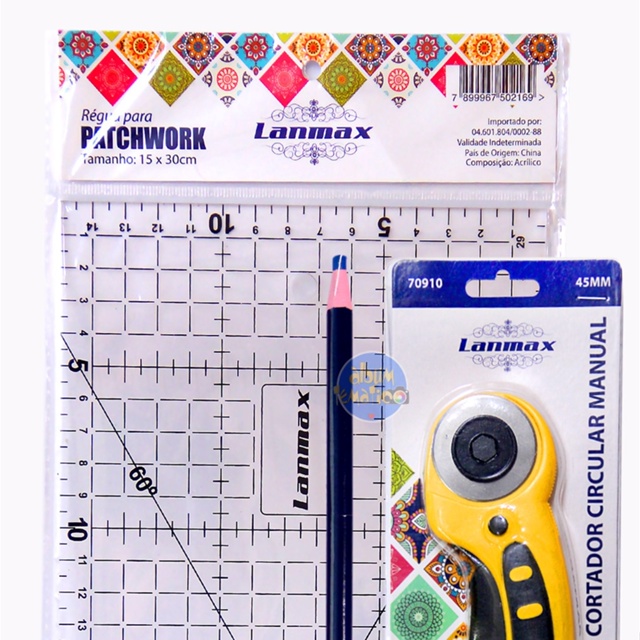 Régua Patchwork Artesanato 15x30 Lanmax + Cortador Circular 45mm + Lápis Tecido