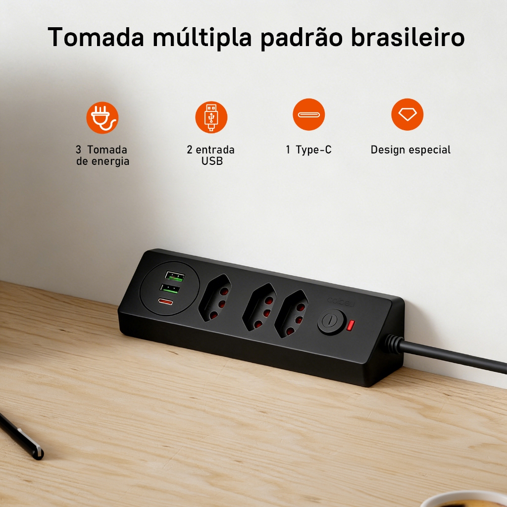 Réguas de tomadas design de prisma triangular Bivolt com USB e Type-C Cabo 1,8m com Interruptor