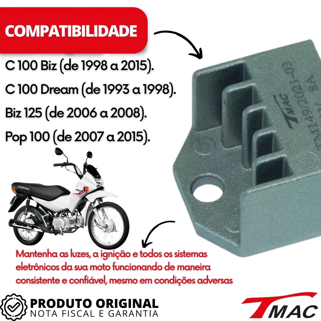 O regulador retificador TMAC para moto é um componente fundamental para manter a eletrônica de sua motocicleta funcionando de forma estável e confiável. Projetado com precisão e qualidade superior, este regulador retificador foi desenvolvido para atender às necessidades dos motociclistas que buscam o melhor desempenho elétrico em suas máquinas. Detalhes: - O regulador retificador TMAC garante uma estabilidade excepcional na tensão elétrica, o que é essencial para proteger os componentes eletrônicos da sua moto contra flutuações prejudiciais; - Equipado com tecnologia de proteção contra sobrecarga, curto-circuito e superaquecimento, este regulador retificador preserva a integridade dos sistemas elétricos da sua moto, prolongando a vida útil dos componentes; - Mantenha as luzes, a ignição e todos os sistemas eletrônicos da sua moto funcionando de maneira consistente e confiável, mesmo em condições adversas; - Projetado para maximizar a eficiência energética, o que significa menos consumo de energia da bateria e maior confiabilidade; - Com um design plug-and-play fácil de instalar, você pode substituir o seu regulador retificador antigo ou danificado de forma rápida e descomplicada; - Construído com materiais de alta qualidade e rigorosos padrões de fabricação, este regulador retificador é altamente durável e resistente ao desgaste, proporcionando uma longa vida útil. Compatibilidade: - Honda C 100 Biz (de 1998 a 2015). - Honda C 100 Dream (de 1993 a 1998). - Honda Biz 125 (de 2006 a 2008). - Honda Pop 100 (de 2007 a 2015). Especificações: - Até 3 meses de garantia contra defeitos de fábrica. Itens Inclusos: - 01 Regulador Retificador.