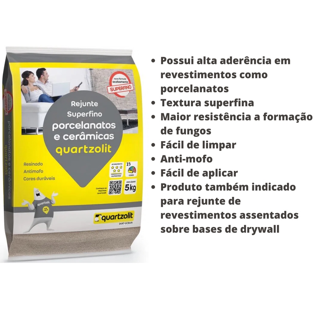 Somos a BZ MATERIAIS PARA CONSTRUÇÃO. TODOS OS PRODUTOS ESTÃO DISPONÍVEIS PARA ENVIO IMEDIATO, SÃO NOVOS E ACOMPANHAM NOTA FISCAL. Qualquer dúvida entre em contato conosco. ---------------------------------------------------------------------- Rejunte Porcelanato Super Fino 5kg Cinza Outono Quartzolit Rejunte cimentício colorido, resinado, siliconado, antimofo e de acabamento superfino. Fácil de limpar e disponível em 11 cores. Indicado para: Parede Interna, Piso, Rodapé, Fachada, Teto, Laje e Telhado, Revestimento antigo. Sobre este produto Verifique a temperatura de trabalho: o produto deve ser aplicado em temperatura do ar ambiente e da base entre 5 °C e 40 °C. Certifique-se que o revestimento tenha sido assentado há 72 horas, ou outro prazo conforme indicação da argamassa colante utilizada. O desrespeito deste prazo poderá provocar manchas no rejuntamento finalizado. Remova o excesso de argamassa colante das juntas e verifique se as mesmas estão limpas e secas. Revestimentos não-esmaltados, antiderrapantes, foscos, porosos, polidos com texturas críticas, baixos e altos relevos por características próprias, estão sujeitos a manchas e/ou podem apresentar dificuldade na remoção dos resíduos do rejunte recém-aplicado. Revestimentos com apliques em ouro, prata ou similares, podem estar sujeitos ao atrito ou manchas. Recomenda-se consulta ao fabricante do revestimento quanto ao produto indicado para rejunte. Características e benefícios -Possui alta aderência em revestimentos como porcelanatos -Textura superfina -Maior resistência a formação de fungos -Grande facilidade de limpeza -Produto também indicado para rejunte de revestimentos assentados sobre bases de drywall. Rendimento aproximado: 20 m² (5kg)