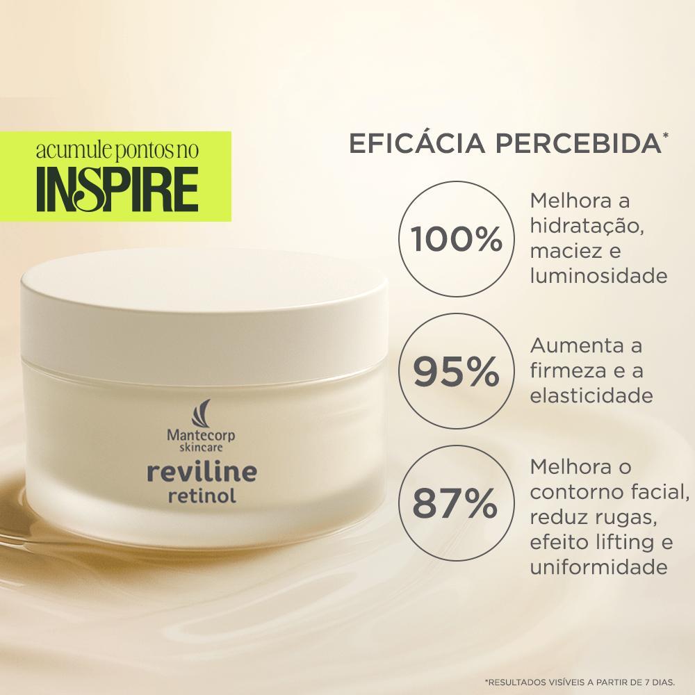 REVILINE RETINOL é um creme rejuvenescedor nutritivo que reduz os sinais de envelhecimento na pele, tais como rugas, flacidez e ressecamento. Sua formulação contém associação de Retinol Nanoencapsulado, Ácido Hialurônico e Acácia do Senegal e Peptídeo Complex. Esses ativos em sinergia, estimulam a produção de colágeno, reduzindo as rugas profundas, melhorando a textura e a firmeza, além de hidratar e nutrir a pele. Reviline Retinol creme reduz os impactos na pele causados pela menopausa (como ressecamento, perda de viço e luminosidade) e ainda tem efeito lift (tensor), deixando a pele mais lisa e macia. Ideal para todos os tipos de pele, inclusive as sensíveis. Não comedogênico e não acnegênico. Resultados comprovados através de estudos clínicos (em mulheres com idade entre 40 e 60 anos).