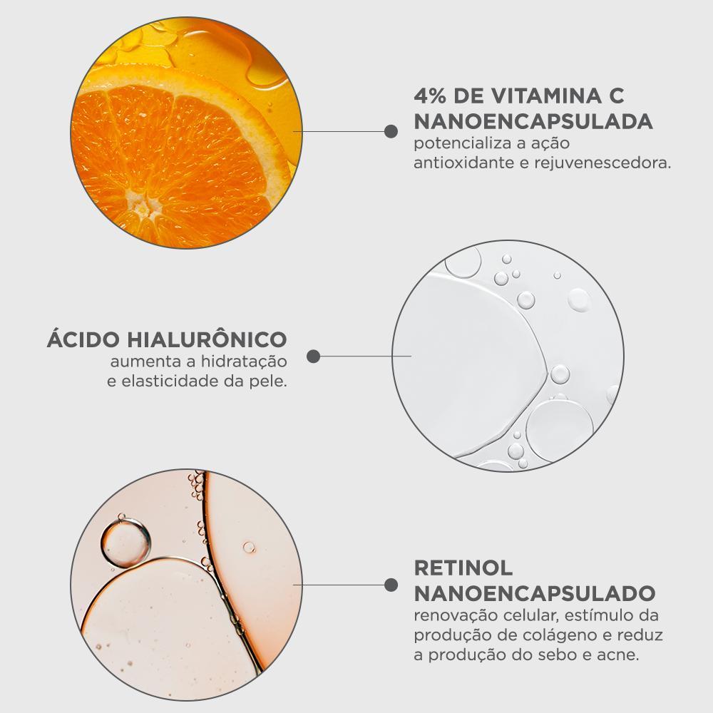 IVY C Corpo e Colo é um sérum rejuvenescedor corporal a base de Vitamina C nanoencapsulada, estabilizada e protegida, com alta ação antioxidante e rejuvenescedora. Também contém Ácido Hialurônico, Retinol e Vitamina E na formulação, que associados promovem: estimulo da produção de colágeno, aumento da renovação celular, hidratação e ação antioxidante. IVY C corpo e colo reduz as linhas finas, uniformiza o tom e melhora a firmeza da pele, deixando-a macia e iluminada.Possui fragrância delicada e textura serum leve, que é rapidamente absorvida pela pele. Contém FPS 20.