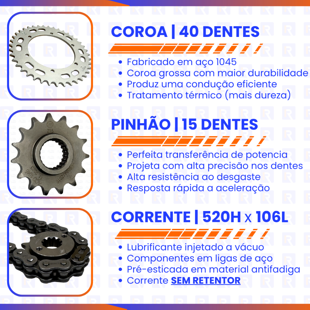 | Relação Nx 400 Falcon Kit Transmissão Padrão Original 40x15 este produto | R$ 104,90 | 25% | 5.0/5 | 21 |