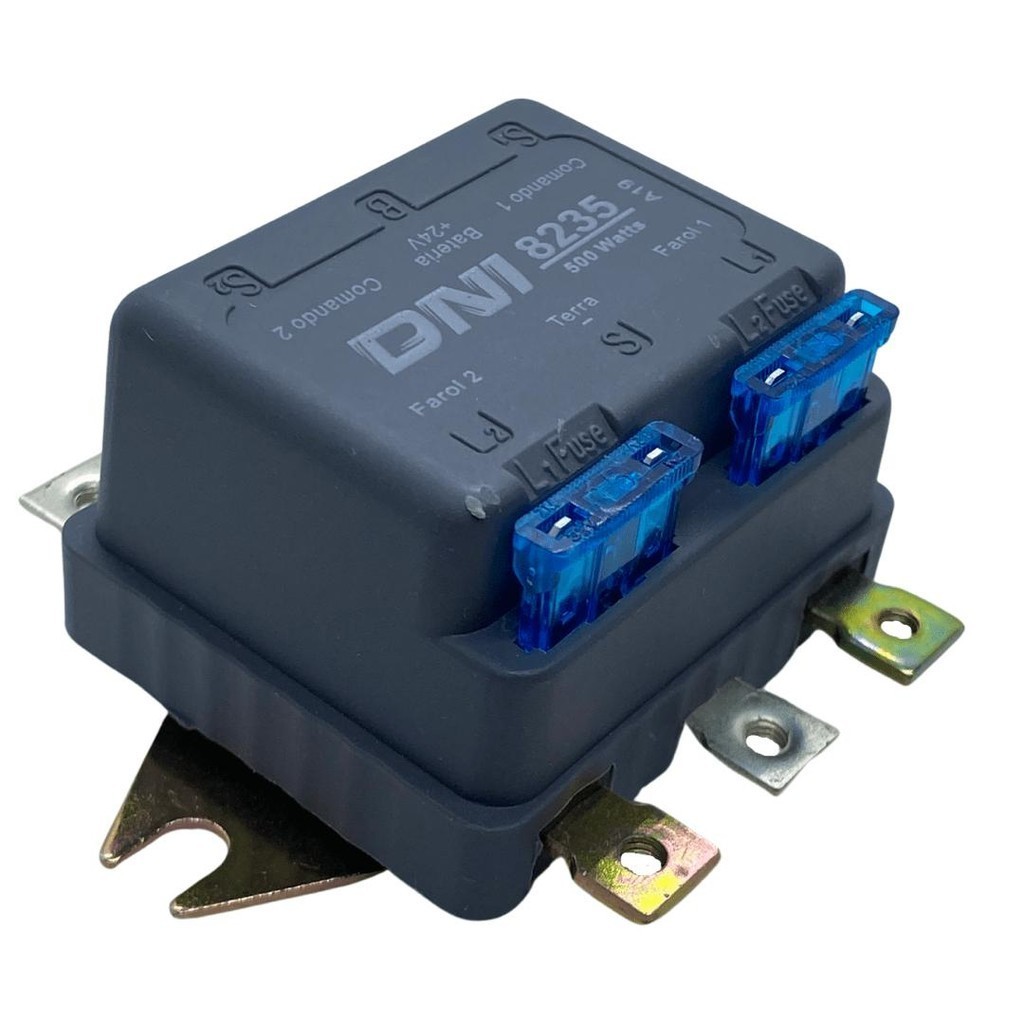 Relé Duplo de Faróis - Universal - 24V.<br><br>Terminais:<br>2 X 250W<br>2 fusíveis Externos<br><br>Envolto em caixa plástica.<br>