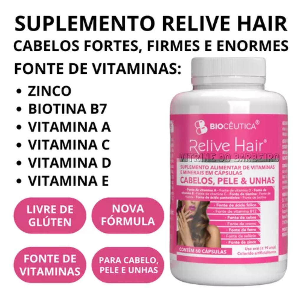 Relive Hair (Cabelos, Pele e Unhas) 60 Cápsulas - Biocêutica Fonte de vitamina A, vitamina D, vitamina E, vitamina C, fonte de Tiâmina, Fonte de Niacina, fonte de ácido pantotênico, fonte de Biotina, fonte de Ácido Fólico, fonte de vitamina B12, Fonte de Cobre, fonte de Cromo, fonte de Ferro, fonte de selênio, fonte de Zinco.