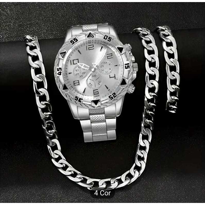 RELOGIO AÇO PRATA + COLAR DE AÇO E PULSEIRA 6MM KIT PARA PRESENTEAR Relógio Masculino Aço inoxidável Kit CORRENTE + PULS