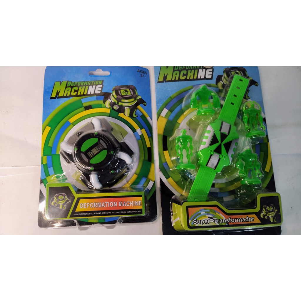 Relógio Ben 10 Emite som e luz O preto acompanha pulseira em tecido O verde já vem com a pulseira verde + 4 mini bonecos O preto funciona como relógio também, o verde não só emite som e luz além dos 4 mini bonecos Material plástico Descrição lançador: Lançador de Pulso com luz e som 4 mini discos (desenhos variados) 4 bonecos do desenho que encaixam no lançador Pulseira de velcro Não mostra a hora(lançador)