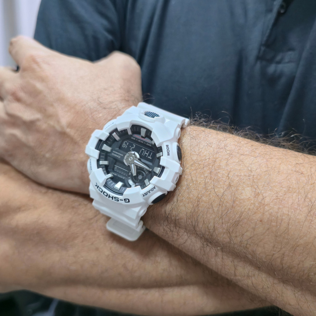 SOBRE A EMPRESA: Somos a Relógios Campana, uma empresa especializada em vendas online, revendedora autorizada das maiores marcas do mercado. Trabalhamos apenas com relógios originais com garantia de fábrica. Comprando conosco você tem a segurança que receberá seu produto nas seguintes condições: ✅ REVENDEDOR AUTORIZADO ✅ PRODUTO ORIGINAL ✅ GARANTIA DO FABRICANTE ✅ PRODUTO NOVO ✅ EMBALAGEM ORIGINAL DO PRODUTO ✅ MANUAL DE INSTRUÇÕES ✅ CERTIFICADO DE GARANTIA ✅ NOTA FISCAL ✅ RELÓGIOS E ÓCULOS A PRONTA-ENTREGA SOBRE O PRODUTO: Um modelo de combinação analógico-digital com um botão frontal, o emblemático visor do G-SHOCK simbolizando a resistência, colocado na posição de 6 horas. Acabamento com estilo dinâmico, avançado e moderno. Melhora a legibilidade usando ponteiros ousados que são espessas e potentes como metal esculpido, criadas usando tecnologia de moldagem de resina proprietária para os ponteiros tridimensionais de hora e minuto. Ele também apresenta um design de visor 3D obtido ao dar tridimensionalidade ao anel do mostrador e aos índices para criar sinergia com os ousados ponteiros. Expressa tenacidade do espírito com a cor preta que simboliza o conceito da marca. O super iluminador e a função de troca de ponteiros operados pelo botão dianteiro fornecem um alto nível de usabilidade. Um G-SHOCK que combina resistência e um robusto design proprietário com um visor 3D. Especificações: Marca: Casio Modelo: GA-700-7ADR Tipo de relógio: Digital e Analógico Gênero: Masculino Cor da caixa: Branco Cor da pulseira: Branco Estilo: Casual Alarme: Sim Cronômetro: Sim Calendário: Sim Luz: Sim Resistência à água: Sim – 20 ATM = 200 metros Tipo de fecho: Fivela Dupla Material da caixa: Resina Material da pulseira: Resina Características do vidro: Vidro Mineral Tamanho da caixa (A x L): 57,5 x 53,4 mm Espessura da caixa: 18,4 mm Comprimento da pulseira: 28 cm Largura da pulseira: 22 mm Tampa do fundo: Parafusado Peso: 69 Gramas Alimentação: Bateria Conteúdo da Embalagem: Relógio, nota fiscal, certificado garantia e manual de instruções Garantia do Fabricante: 12 meses Fabricante: Casio Brasil