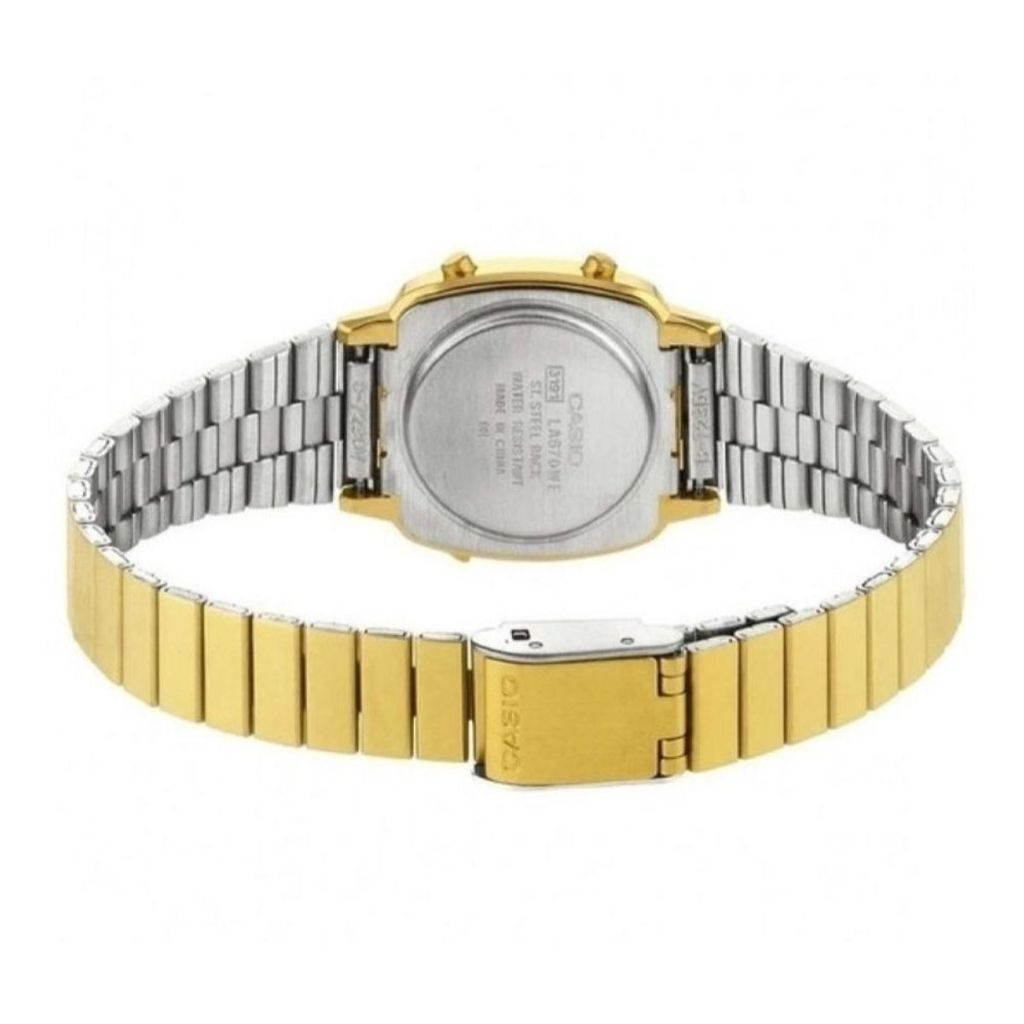 Especificações Técnicas: Marca: Casio Referência: LA670WGA9DF Gênero: Feminino / Unissex Cor da Pulseira: Dourado Cor da Caixa: Dourado Material da Pulseira: Aço inoxidável Material da Caixa: Aço inoxidável Tamanho da Caixa: Aproximadamente 30 × 24 mm Resistência à água: 30 metros Tipo de movimento: Digital Características do vidro: Vidro de resina