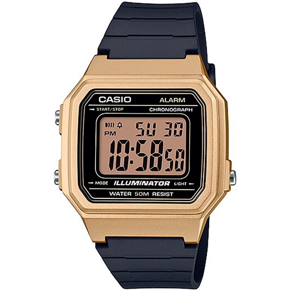 Relógio CasioModelo W-217hm 9avdfDigital IluminatorTamanho: Tradicional Funções - Digital- Calendario dia do mes / semana- Alarme diario- Sinal de hora em hora- Cronometro- Luz noturna Características- Bateria- Botoes: Simples- Tampa posterior : Parafusado- Resistência à água : 50M- Pode nadar: Sim- Pode lavar mãos: Sim- Pode tomar Chuva: Sim- Pode tomar Banho: Não- Mostrador Positivo- Material da caixa: Resina Dourado- Material da pulseira: Borracha preta Medidas- Diâmetro da caixa : 3,8 cm- Diametro do mostrador: 2,8 cm- Espessura da caixa : 1 cm- Largura da pulseira: 1,8 cm
