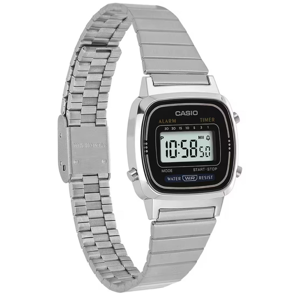 Especificações Técnicas: Marca: Casio Referência: LA670WA1DF Gênero: Feminino / Unissex Cor da Pulseira: Prata Cor da Caixa: Prata Material da Pulseira: Aço Inoxidável Material da Caixa: Resina com acabamento cromado Tamanho da Caixa: Aproximadamente 38 mm x 33 mm (dimensões aproximadas) Resistência à água: 3 ATM (resistente a respingos) Tipo de movimento: Digital (Quartzo) Características do vidro: Acrílico