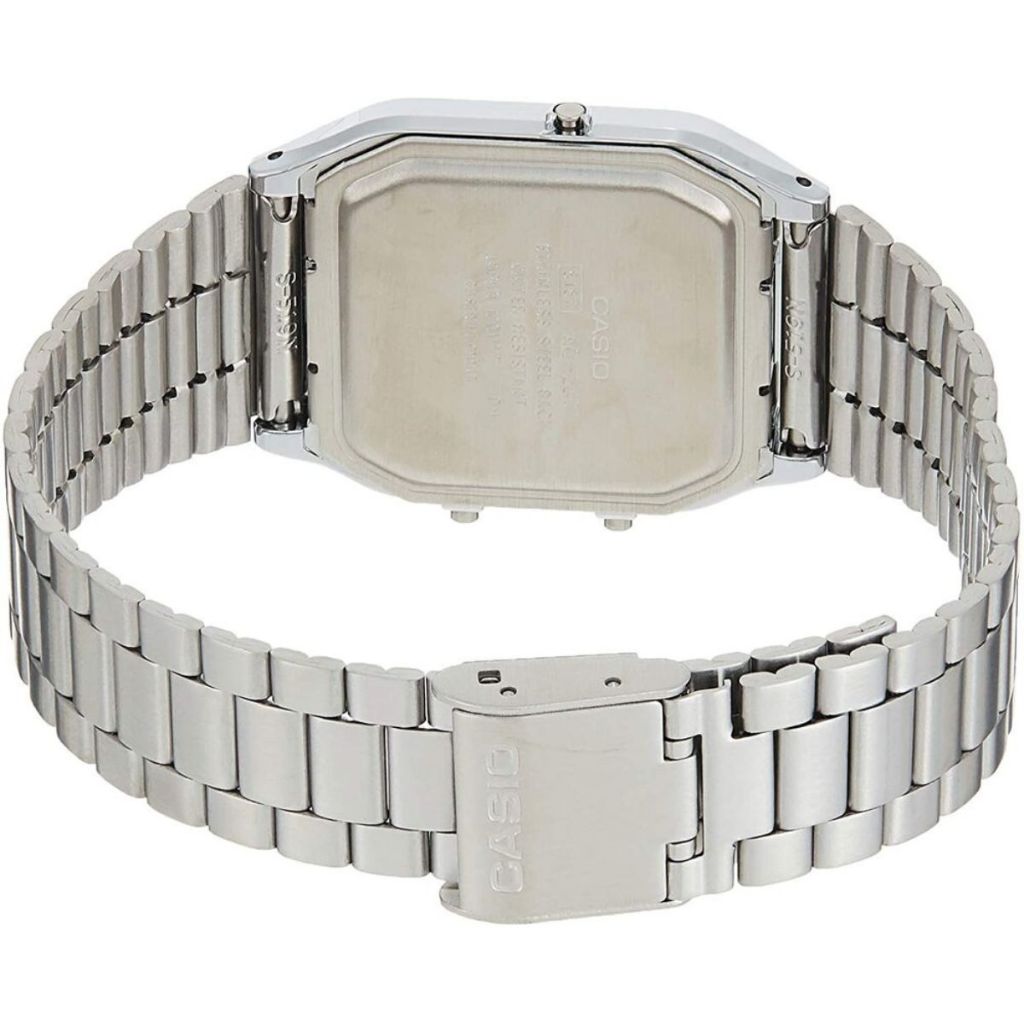 Especificações Técnicas: Marca: Casio Referência: AQ230A1DMQ Gênero: Unissex Cor da Pulseira: Prata Cor da Caixa: Prata Material da Pulseira: Aço inoxidável Material da Caixa: Resina cromada Tamanho da Caixa: 38,8 × 29,8 × 8,1 mm Resistência à água: 30 metros Tipo de movimento: Analógico-Digital Características do vidro: Vidro de resina
