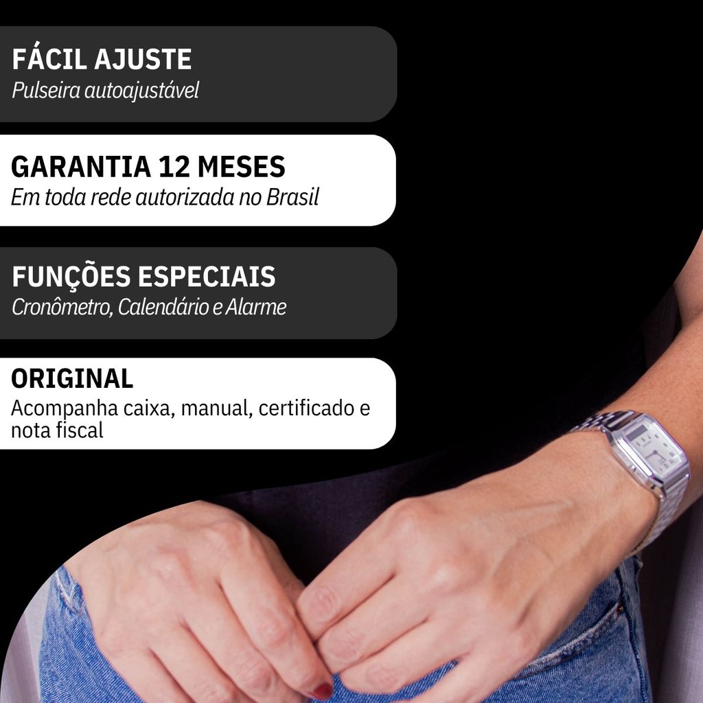 Você está procurando um relógio digital Unissex vintage para acompanhar o seu dia a dia? Seja bem vindo à RBM RELÓGIOS - todos os nossos relogios são originais e a pronta entrega para envio imediato. Veja as PRINCIPAIS CARACTERÍSTICAS do Relógio Unissex Casio Prata Informações Básicas Marca: CASIO Modelo: AQ-230A-7BMQ Gênero: Unissex Resistência à Água: Pode ter contato leve com a água, tomar chuva, lavar as mãos, lavar o carro Medidas do Relógio Tamanho da Caixa (C x L x A): 38,8 × 29,8 × 8,1mm (PEQUENO) Circunferência Máxima da Pulseira: 19 cm (DIÂMETRO MÁXIMO NO PULSO) Largura da Pulseira: 1,0 cm Peso: 47 gramas Materiais do Relógio Composição do Vidro: Resina (RESISTENTE A RISCOS) Material da Caixa: Resina Cromado Material da Pulseira: Aço Inox Material da Tampa: Aço Inox Características do Relógio Mecanismo: Anadigi Alimentação: Bateria (Quartz) Duração aproximada da bateria: 3 anos Fecho: Ajustável FUNÇÕES ESPECIAIS Hora mundial Hora dupla Cronômetro Cronômetro de 1/100 de segundo Capacidade de medição: 59'59,99'' Modo de medição: Tempo transcorrido Alarme / Sinalização Alarme diário Sinalização a cada hora Calendário Calendário automático (fevereiro com 28 dias) Precisão Precisão: ±30 segundos por mês Outros recursos Formatos de 12/24 horas Indicação das horas regular: Analógico: 2 ponteiros (hora, minuto) Digital: Hora, minuto, segundo, pm, mês, data, dia Cores Mostrador: Branco Caixa: Prata Pulseira: Prata Garantia 1 ano de garantia em todo território nacional com a rede autorizada Conteúdo da Embalagem O relógio vai na caixa original, com a nota fiscal, certificado de garantia e manual de instrução. VAMOS CONHECER MELHOR SOBRE A LOJA RBM WEBSHOP RELOGIOS? Somos uma das melhores e maiores lojas de relogios no Brasil. Todos os relógios vendidos pela nossa loja são 100% originais, contém nota fiscal, certificado, manual de instruções e garantia de 12 meses com a rede de assistência em todo o Brasil. Dúvidas? Pergunte, e será um enorme prazer lhe atender!