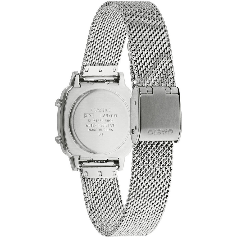 Especificações Técnicas Relógio Casio Vintage LA670WEM-7DF - Gênero: Feminino - Mecanismo: Digital - Alimentação: Bateria - Composição do Vidro: Resina - Material da Caixa: Aço Inoxidável - Material da Pulseira: Aço Inoxidável - Resistência à Água: 3 ATM ? 30 Mts. - Espessura da Caixa: 33,5mm - Largura da Caixa: 8mm -Peso: 30g - Itens Inclusos na Caixa: Relógio, manual de instruções, certificado de garantia - Prazo de Garantia: 12 meses (Rede de Autorizadas) Relógio 100% Original, acompanha caixa, manual, certificado de garantia Casio e NF. Somos revendedores oficial e autorizado da CASIO (fabricado e comercializado pela CASIO BRASIL COMÉRCIO PRODUTOS ELETRONICOS LTDA), todos os relógios comercializados pela nossa empresa possuem GARANTIA NACIONAL do FABRICANTE e caso o produto que adquiriu apresente algum defeito durante o período da garantia, basta encaminhá-lo diretamente à assistência técnica mais próxima de sua região, sempre acompanhado do CERTIFICADO de GARANTIA e NOTA FISCAL.
