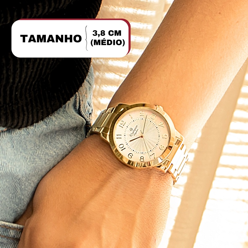Você está procurando um relógio analógico feminino elegante e sofisticado para acompanhar o seu dia a dia? Seja bem vindo à RBM WEBSHOP - todos os nossos relogios são originais e a pronta entrega para envio imediato. Veja as PRINCIPAIS CARACTERÍSTICAS do Relógio Feminino Champion Dourado Informações Básicas Marca: Champion Modelo: CN25118G Gênero: Feminino Resistência à Água: 5atm – 50mts: Pode ser usado para nadar, praticar esportes e lavar as mãos Medidas do Relógio Tamanho (DIÂMETRO): 4,0 cm (MÉDIO) Espessura: 1 cm Largura da Pulseira: 2 cm Circunferência da Pulseira: 20 cm Peso: 105 gramas Materiais do Relógio Composição do Vidro: Cristal Mineral (RESISTENTE A RISCOS) Material da Caixa: Metal Material da Pulseira: Aço Inox Material da Tampa: Aço Inox Características do Relógio Mecanismo: Quartz Alimentação: Bateria com vida útil 2 anos Fecho: De abotoar, com trava e dois botões Fundo: Rosca Cores Mostrador: Branco Caixa: Dourada Pulseira: Dourada Medidas da Bolsa: Largura: 23 cm Altura: 12,5 cm Altura da bolsa com o fecho: 14,3 cm Garantia: 1 ano de garantia em todo território nacional com a rede autorizada Conteúdo da Embalagem O relógio vai dentro da bolsa, com a nota fiscal, certificado de garantia e manual de instrução. VAMOS CONHECER MELHOR SOBRE A LOJA RBM WEBSHOP RELOGIOS? Somos uma das melhores e maiores lojas de relogios no Brasil. Todos os relógios vendidos pela nossa loja são 100% originais, contém nota fiscal, certificado, manual de instruções e garantia de 12 meses com a rede de assistência em todo o Brasil. Dúvidas? Pergunte, e será um enorme prazer lhe atender!