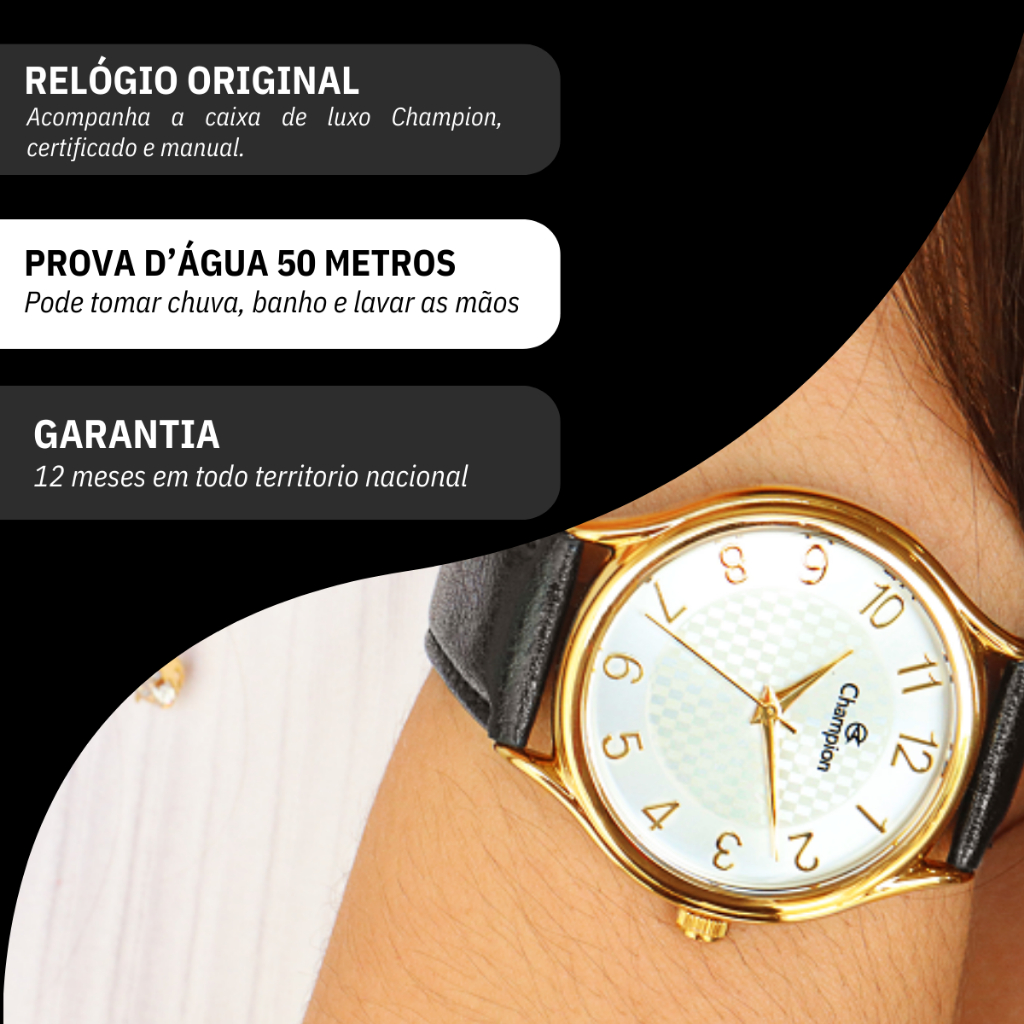 Você está procurando um relógio feminino sofisticado para acompanhar o seu dia a dia? Seja bem vindo à RBM WEBSHOP - todos os nossos relógios são originais e a pronta entrega para envio imediato. Veja as PRINCIPAIS CARACTERÍSTICAS do Relógio Champion Dourado Couro Informações Básicas Marca: Champion Modelo: CH22706W Gênero: Feminino Resistência à Água: 5atm – 50mts: Pode ser usado para nadar, praticar esportes e lavar as mãos Medidas do Relógio Tamanho (DIÂMETRO): 4,0 cm (MÉDIO) Espessura: 1 cm Largura da Pulseira: 2 cm Circunferência da Pulseira: 19 cm Peso: 43 gramas Materiais do Relógio Composição do Vidro: Cristal Mineral (RESISTENTE A RISCOS) Material da Caixa: Metal Material da Pulseira: Couro Material da Tampa: Aço Inox Características do Relógio Mecanismo: Quartz Alimentação: Bateria com vida útil aproximada 2 anos Fecho: Fecho Fivela (Buckle) Fundo: Rosca Cores Mostrador: Branco Caixa: Dourado Pulseira: Preto Garantia 1 ano de garantia em todo território nacional com a rede autorizada Conteúdo da Embalagem O relógio vai na caixa original, colar e brincos, com a nota fiscal, certificado de garantia e manual de instrução. VAMOS CONHECER MELHOR SOBRE A LOJA RBM WEBSHOP RELOGIOS? Somos uma das melhores e maiores lojas de relogios no Brasil. Todos os relógios vendidos pela nossa loja são 100% originais, contém nota fiscal, certificado, manual de instruções e garantia de 12 meses com a rede de assistência em todo o Brasil. Dúvidas? Pergunte, e será um enorme prazer lhe atender!