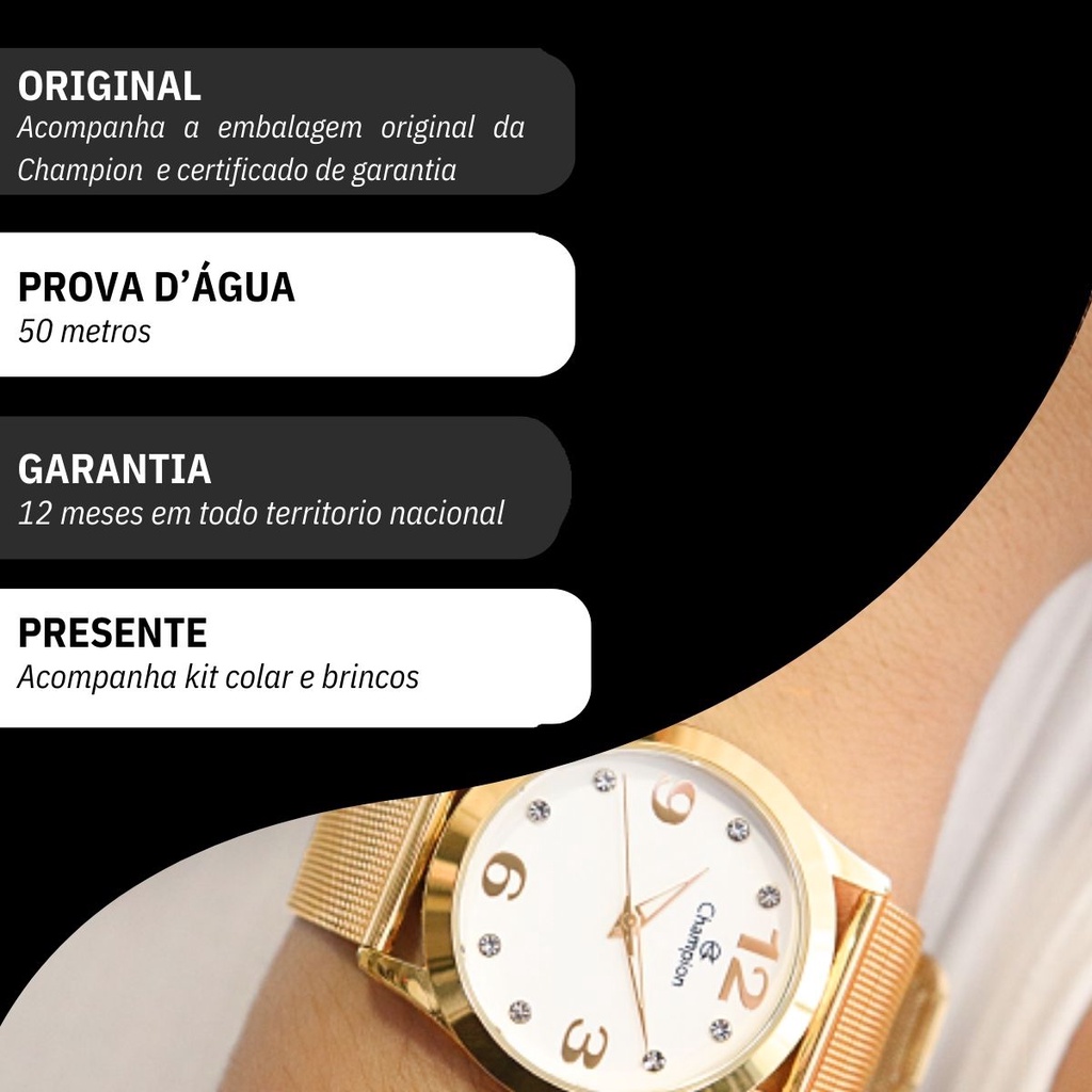 Relógio Champion Feminino Analógico Dourado Kit de Brincos e Colar Original À Prova d'Água CN29098W