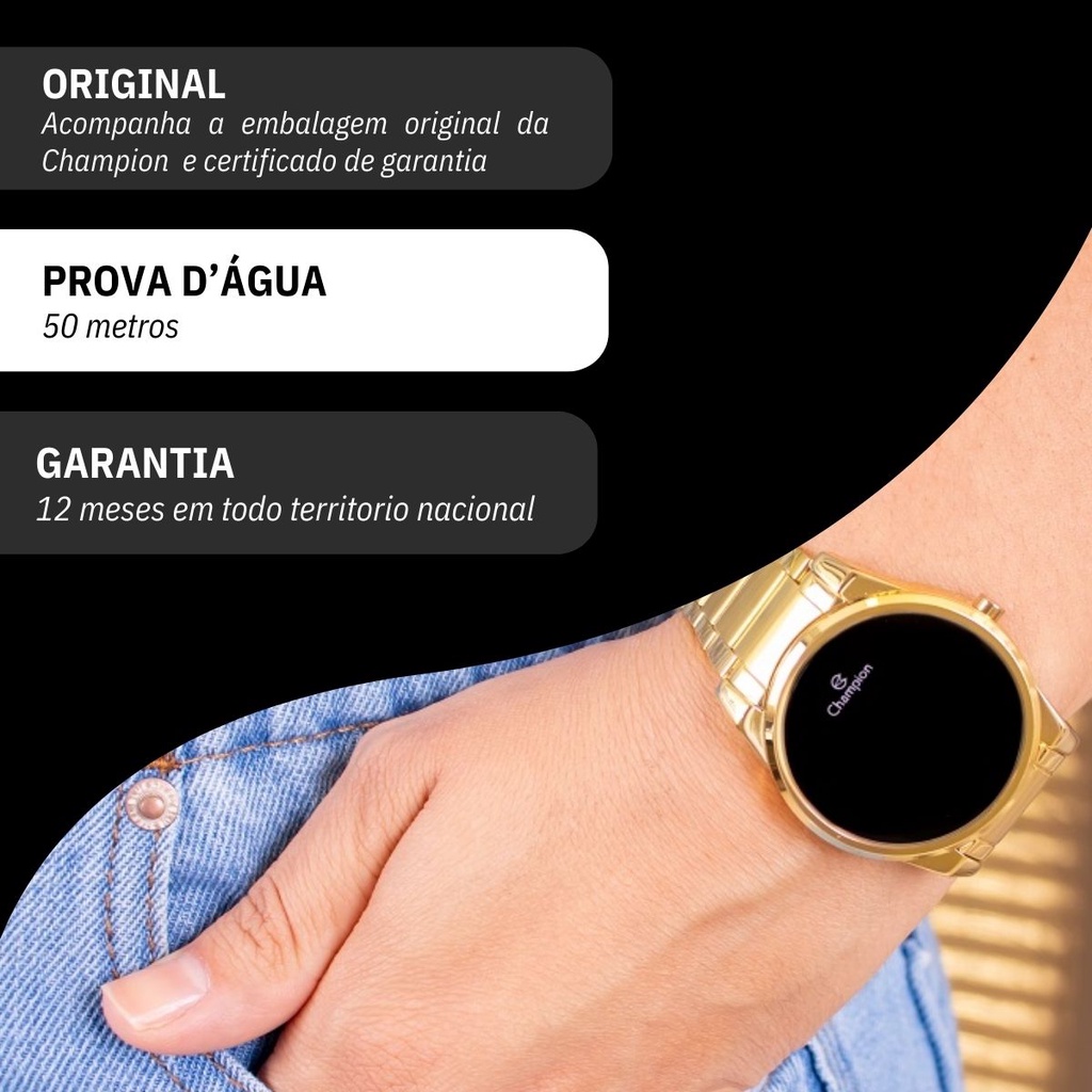 Você está procurando um relógio digital Dourado para acompanhar o seu dia a dia? Seja bem vindo à RBM WEBSHOP - todos os nossos relogios são originais e a pronta entrega para envio imediato. Veja as PRINCIPAIS CARACTERÍSTICAS do Relógio Feminino Dourado Digital Informações Básicas Marca: Champion Modelo: CH40124H Gênero: Feminino Resistência à Água: 5atm – 50mts: Pode ser usado para nadar, praticar esportes e lavar as mãos Medidas do Relógio Tamanho (diâmetro da caixa): 4,0 cm (MÉDIO) Circunferência da pulseira e tamanho máximo de ajuste de punho: 19 cm Espessura: 0,9 cm Largura da Pulseira: 2,0 cm Peso: 110 gramas Materiais do Relógio Composição do Vidro: Cristal Mineral (RESISTENTE A RISCOS) Material da Caixa: Metal Material da Pulseira: Aço Inox Material da Tampa: Aço Inox Características do Relógio Mecanismo: Analógico Alimentação: Bateria Duração aproximada da bateria: 2 anos Fecho: Fecho Dobrável com Botão (Folding Clasp with Push-Button) Tampa Posterior: Pressão Funções Especiais Calendário Cores Mostrador: Preto Caixa: Dourado Pulseira: Dourado Garantia 1 ano de garantia em todo território nacional com a rede autorizada Conteúdo da Embalagem Este produto acompanha Manual em Português e Nota Fiscal, Kit Colar e Brincos, Embalagem de Fabrica Original e Garantia Nacional do Fabricante. VAMOS CONHECER MELHOR SOBRE A LOJA RBM WEBSHOP RELOGIOS? Somos uma das melhores e maiores lojas de relogios no Brasil. Todos os relógios vendidos pela nossa loja são 100% originais, contém nota fiscal, certificado, manual de instruções e garantia de 12 meses com a rede de assistência em todo o Brasil. Dúvidas? Pergunte, e será um enorme prazer lhe atender!