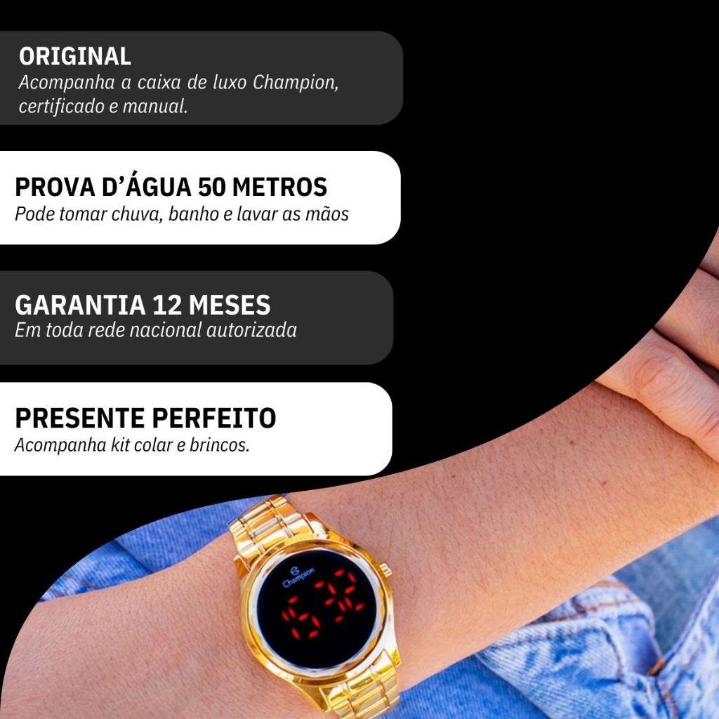 Quer conhecer as melhores marcas de relógios com os melhores preços? Seja bem-vindo à RBM WEBSHOP - Aqui você encontra relógios originais, que acompanham a caixa, nota fiscal e a garantia de um ano do fabricante. Abaixo colocamos algumas informações como o tamanho, a cor, as especificações sobre resistência à água, o material do relógio e todo o necessário. Após a confirmação do pagamento, nós prepararemos o seu pacote em uma embalagem segura e lacrada, e você receberá o código de rastreamento. Ah, e depois você pode avaliar tanto nossa loja como o produto, pois a sua opinião é muito importante para melhorar cada vez mais nossos serviços! Seja bem-vindo sempre e sinta-se seguro. Esse é nosso compromisso! RBM WEBSHOP RELÓGIOS DO BRASILCNPJ 17.957.878-0001-12Loja Autorizada VAMOS CONHECER MELHOR O RELÓGIO? Informações Básicas Marca: Champion Referencia: CH48019V Gênero: Feminino Características Composição do Vidro: Cristal Mineral Material da Caixa: Metal Material da Pulseira: Aço Modelo : Digital Mecanismo: Quartz Alimentação: Bateria Resistência à Água: 5 ATM Diâmetro da Caixa: 3,7 cm