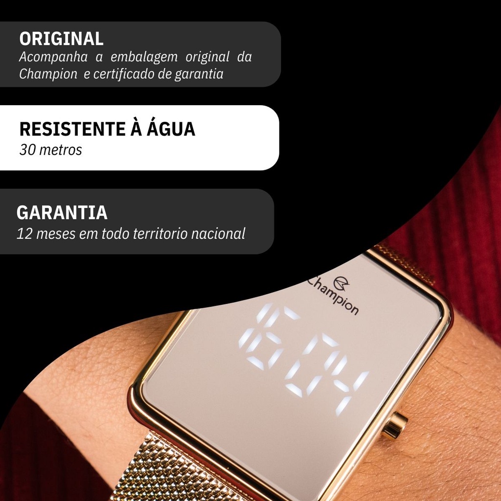 Você está procurando um relógio moderno e sofisticado para acompanhar o seu dia a dia? Seja bem vindo à RBM WEBSHOP - todos os nossos relógios são originais e a pronta entrega para envio imediato. Veja as PRINCIPAIS CARACTERÍSTICAS do Relógio Feminino Dourado Espelhado Informações Básicas Marca: Champion Modelo: CH40080B Gênero: Feminino Resistência à Água: 3atm – 30mts: Pode ter contato superficial com a água, como ao lavar as mãos ou tomar uma chuva Medidas do Relógio Tamanho: Largura: 3,4 cm Altura: 4,4 cm (MÉDIO) Circunferência da pulseira e tamanho máximo de ajuste de punho: 19 cm Espessura: 1,0 cm Largura da Pulseira: 2,4 cm Peso: 127 gramas Materiais do Relógio Composição do Vidro: Cristal Mineral (RESISTENTE A RISCOS) Material da Caixa: Metal Material da Pulseira: Aço Inox Material da Tampa: Aço Inox Características do Relógio Mecanismo: Digital Alimentação: Bateria Duração aproximada da bateria: 2 anos Fecho: Deslizante, com trava e pressão (Não é necessário remover elos; você mesmo ajusta facilmente) Tampa Posterior: Rosca Cores Mostrador: Prata Caixa: Dourado Pulseira: Dourado Garantia 1 ano de garantia em todo território nacional com a rede autorizada Conteúdo da Embalagem Este produto acompanha Manual em Português e Nota Fiscal, Kit Colar e Brincos, Embalagem de Fabrica Original e Garantia Nacional do Fabricante. VAMOS CONHECER MELHOR SOBRE A LOJA RBM WEBSHOP RELOGIOS? Somos uma das melhores e maiores lojas de relogios no Brasil. Todos os relógios vendidos pela nossa loja são 100% originais, contém nota fiscal, certificado, manual de instruções e garantia de 12 meses com a rede de assistência em todo o Brasil. Dúvidas? Pergunte, e será um enorme prazer lhe atender!