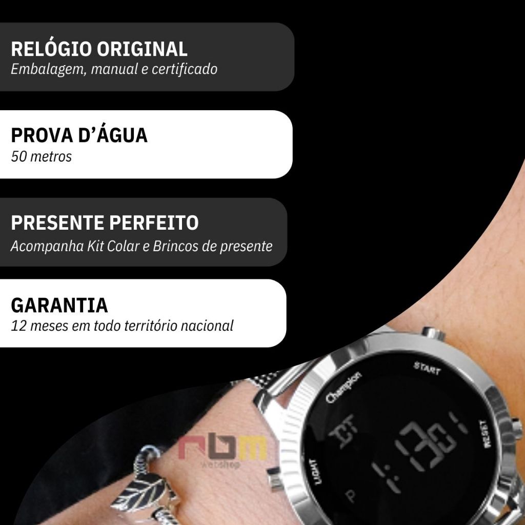 Você está procurando um relógio prata digital para acompanhar o seu dia a dia? Seja bem vindo à RBM WEBSHOP - todos os nossos relógios são originais e a pronta entrega para envio imediato. Veja as PRINCIPAIS CARACTERÍSTICAS do Champion Feminino Prata CH40062T Informações Básicas Marca: Champion Modelo: CH40062T Gênero: Feminino Resistência à Água: 5atm – 50mts: Pode ser usado para nadar, praticar esportes e lavar as mãos Medidas do Relógio Tamanho (DIÂMETRO): 4,2 cm (MÉDIO) Espessura: 1,0 cm Largura da Pulseira: 2,0 cm Circunferência da Pulseira: 21 cm Peso: 112 gramas Materiais do Relógio Composição do Vidro: Cristal Mineral (RESISTENTE A RISCOS) Material da Caixa: Metal Material da Pulseira: Aço Inox Material da Tampa: Aço Inox Características do Relógio Mecanismo: Digital Alimentação: Bateria com vida útil 2 anos Fecho: Fecho Gancho (Hook Buckle) Fundo: Rosca Cores Mostrador: Prata Caixa: Prata Pulseira: Prata Garantia: 1 ano de garantia em todo território nacional com a rede autorizada Conteúdo da Embalagem O relógio vai na caixa original, com a nota fiscal, certificado de garantia e manual de instrução. VAMOS CONHECER MELHOR SOBRE A LOJA RBM WEBSHOP RELOGIOS? Somos uma das melhores e maiores lojas de relogios no Brasil. Todos os relógios vendidos pela nossa loja são 100% originais, contém nota fiscal, certificado, manual de instruções e garantia de 12 meses com a rede de assistência em todo o Brasil. Dúvidas? Pergunte, e será um enorme prazer lhe atender!