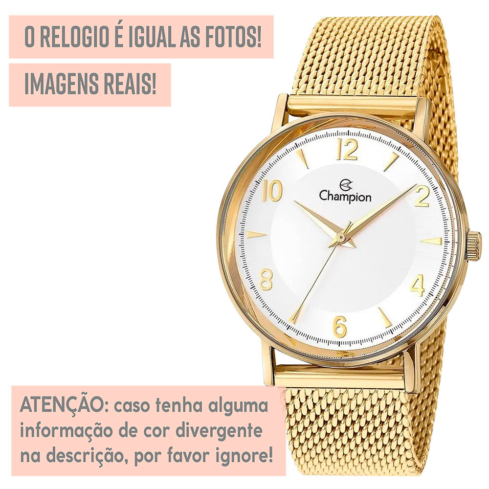 Procurando um presente perfeito? Encontrou! Dê o lindo kit Champion de presente para você mesmo, ou para alguém querido! *1 ANO DE GARANTIA CHAMPION - Produto com NOTA FISCAL* *ACOMPANHA SEMI JOIAS DE COLAR E BRINCOS* Atuamos somente com produtos 100% ORIGINAIS! Leve em um especialista de sua região para comprovar. Ficha Técnica PROVA D'ÁGUA: Sim – selo de resistência 5 ATM (resistência até 50 metros de profundidade) MATERIAL DO VIDRO: Cristal mineral resistente a riscos MAQUINÁRIO: Analógico – quartzo - bateria MATERIAL DO RELÓGIO: Liga de aço COR DO FUNDO: Marrom Medidas TAMANHO DA CAIXA (mostrador): 4,0 cm (40 mm) ESPESSURA DA CAIXA (mostrador): 1,0 cm (10 mm) LARGURA DA PULSEIRA: 1,9 cm (19 mm) CIRCUNFERÊNCIA DA PULSEIRA: 26 cm (pode ser diminuída para servir em todo tipo de pulso) Acompanha Relógio Champion, par de brincos, colar, caixa original Champion, manual de instruções em português, certificado de garantia e nota fiscal. A Champion produz as joias que acompanham o relógio, de forma sortida, portanto as mesmas podem variar das imagens. Nossos produtos são todos tratados com máximo cuidado, profissionalismo e atenção. Enviamos o seu relógio em uma embalagem reforçada, protegida por dentro e por fora. Caso não tenha gostado ou simplesmente se arrependeu, devolva o produto sem preocupações. Você tem 30 dias a partir do recebimento para devolvê-lo. COMPRE COM SEGURANÇA Revendedor autorizado Champion.