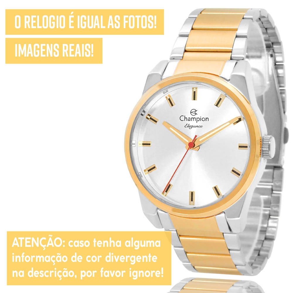 Bem vindo! Procurando um presente perfeito? Encontrou! Dê o lindo kit Champion de presente para você mesmo, ou para alguém querido! *1 ANO DE GARANTIA CHAMPION - Produto com NOTA FISCAL* *ACOMPANHA SEMI JOIAS COLAR E BRINCOS* Atuamos somente com produtos 100% ORIGINAIS! Leve em um especialista de sua região para comprovar. Ficha Técnica PROVA D'ÁGUA: Sim - selo de resistência 5 ATM (resistência até 50 metros de profundidade) MATERIAL DO VIDRO: Cristal mineral resistente a riscos MAQUINÁRIO: Analógico – quartzo - bateria MATERIAL DO RELÓGIO: Liga de aço. Medidas TAMANHO DA CAIXA (mostrador): 4,2 cm (42 mm) ESPESSURA DA CAIXA (mostrador): 1,1 cm (11 mm) LARGURA DA PULSEIRA: 2,0 cm (20mm) CIRCUNFERÊNCIA DA PULSEIRA: 26 cm Acompanha Relógio Champion, colar e brincos, caixa original Champion, manual de instruções em português, certificado de garantia e nota fiscal. A Champion produz as joias que acompanham o relógio (brindes) de forma sortida, portanto as mesmas podem variar das imagens Nossos produtos são todos tratados com máximo cuidado, profissionalismo e atenção. Enviamos o seu relógio em uma embalagem reforçada, protegida por dentro e por fora. Caso não tenha gostado ou simplesmente se arrependeu, devolva o produto sem preocupações. Você tem 30 dias a partir do recebimento para devolvê-lo. COMPRE COM SEGURANÇA Revendedor autorizado Champion