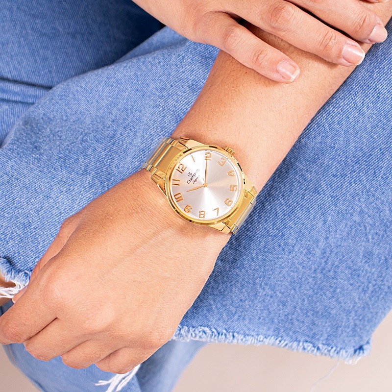 Você está procurando um relógio analógico feminino elegante e sofisticado para acompanhar o seu dia a dia? Seja bem vindo à RBM WEBSHOP - todos os nossos relogios são originais e a pronta entrega para envio imediato. Veja as PRINCIPAIS CARACTERÍSTICAS do Relógio Feminino Champion Dourado Informações Básicas Marca: Champion Modelo: CN27652W Gênero: Feminino Resistência à Água: 5atm – 50mts: Pode ser usado para nadar, praticar esportes e lavar as mãos Medidas do Relógio Tamanho (DIÂMETRO): 4,0 cm (MÉDIO) Espessura: 1 cm Largura da Pulseira: 2 cm Circunferência da Pulseira: 20 cm Peso: 105 gramas Materiais do Relógio Composição do Vidro: Cristal Mineral (RESISTENTE A RISCOS) Material da Caixa: Metal Material da Pulseira: Aço Inox Material da Tampa: Aço Inox Características do Relógio Mecanismo: Quartz Alimentação: Bateria com vida útil 2 anos Fecho: De abotoar, com trava e dois botões Fundo: Rosca Cores Mostrador: Champanhe Caixa: Dourada Pulseira: Dourada Garantia: 1 ano de garantia em todo território nacional com a rede autorizada Conteúdo da Embalagem O relógio vai na caixa original, kit colar e brincos, com a nota fiscal, certificado de garantia e manual de instrução. VAMOS CONHECER MELHOR SOBRE A LOJA RBM WEBSHOP RELOGIOS? Somos uma das melhores e maiores lojas de relogios no Brasil. Todos os relógios vendidos pela nossa loja são 100% originais, contém nota fiscal, certificado, manual de instruções e garantia de 12 meses com a rede de assistência em todo o Brasil. Dúvidas? Pergunte, e será um enorme prazer lhe atender!