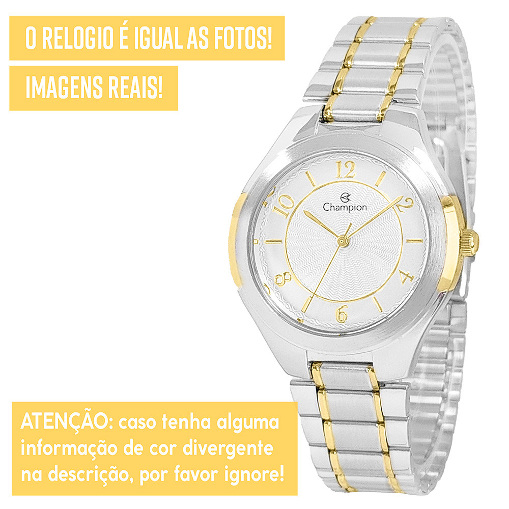 Procurando um presente perfeito? Encontrou! Dê um lindo kit Champion de presente para você mesmo, ou para alguém querido! *1 ANO DE GARANTIA CHAMPION - Produto com NOTA FISCAL* *ACOMPANHA SEMI JOIAS COLAR E BRINCOS* Atuamos somente com produtos 100% ORIGINAIS! Leve em um especialista de sua região para comprovar. Ficha Técnica PROVA D'ÁGUA: Sim - selo de resistência 5 ATM (resistência até 50 metros de profundidade) MATERIAL DO VIDRO: Cristal mineral resistente a riscos MAQUINÁRIO: Analógico - quartzo - bateria MATERIAL DO RELÓGIO: Liga de aço. COR DO MOSTRADOR: Prata Medidas TAMANHO DA CAIXA (mostrador): 3,8 cm (38 mm) ESPESSURA DA CAIXA (mostrador): 0,9 cm (9 mm) LARGURA DA PULSEIRA: 1,6 cm (16 mm) CIRCUNFERÊNCIA DA PULSEIRA: 26 cm Acompanha Relógio Champion, colar e brincos, caixa original Champion, manual de instruções em português, certificado de garantia e nota fiscal. Nossos produtos são todos tratados com máximo cuidado, profissionalismo e atenção. Enviamos o seu relógio em uma embalagem reforçada, protegida por dentro e por fora. COMPRE COM SEGURANÇA Revendedor autorizado Champion