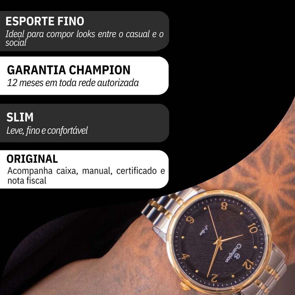Você está procurando um relógio analógico masculino para acompanhar o seu dia a dia? Seja bem vindo à RBM WEBSHOP - todos os nossos relogios são originais e a pronta entrega para envio imediato. Veja as PRINCIPAIS CARACTERÍSTICAS do Relógio Masculino Champion Bicolor S-Line Informações Básicas Marca: Champion Modelo: CN21194P Gênero: Masculino Resistência à Água: 3atm – 30mts: Pode tomar uma chuva e lavar as mãos Medidas do Relógio Tamanho (diâmetro): 4,0 cm (PEQUENO) Circunferência da pulseira e tamanho máximo de ajuste de punho: 20 cm Espessura: 0,7 cm Largura da Pulseira: 1,8 cm Peso: 72 gramas Materiais do Relógio Composição do Vidro: Cristal Mineral (RESISTENTE A RISCOS) Material da Caixa: Metal Material da Pulseira: Aço Inox Material da Tampa: Aço Inox Características do Relógio Mecanismo: Analógico Alimentação: Bateria Duração aproximada da bateria: 2 anos Fecho: Fecho Dobrável com Botão (Folding Clasp with Push-Button) Tampa Posterior: Pressão Cores Mostrador: Preto Caixa: Bicolor Pulseira: Bicolor Garantia 1 ano de garantia em todo território nacional com a rede autorizada Conteúdo da Embalagem Este produto acompanha Manual em Português e Nota Fiscal, Embalagem de Fabrica Original e Garantia Nacional do Fabricante. VAMOS CONHECER MELHOR SOBRE A LOJA RBM WEBSHOP RELOGIOS? Somos uma das melhores e maiores lojas de relogios no Brasil. Todos os relógios vendidos pela nossa loja são 100% originais, contém nota fiscal, certificado, manual de instruções e garantia de 12 meses com a rede de assistência em todo o Brasil. Dúvidas? Pergunte, e será um enorme prazer lhe atender!