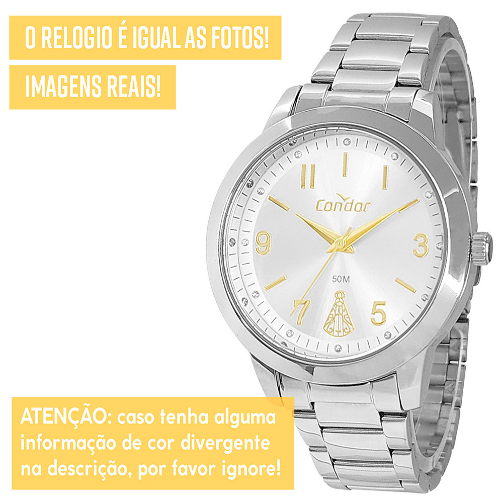 Procurando um presente perfeito? Encontrou! Dê um lindo relógio Condor de presente para você mesmo, ou para alguém querido! *1 ANO DE GARANTIA Condor - Produto com NOTA FISCAL* *ACOMPANHA SEMI JOIAS COLAR E BRINCOS* Atuamos somente com produtos 100% ORIGINAIS! Leve em um especialista de sua região para comprovar. Ficha Técnica RESISTENTE A ÁGUA: Sim - selo de resistência 5 ATM MATERIAL DO VIDRO: Cristal mineral resistente a riscos MAQUINÁRIO: Analógico MATERIAL DO RELÓGIO: Liga de aço COR DO FUNDO: Prata Medidas TAMANHO DA CAIXA (mostrador): 4,3 cm (43 mm) ESPESSURA DA CAIXA (mostrador): 1,1 cm (11 mm) LARGURA DA PULSEIRA: 1,6 cm (16 mm) CIRCUNFERÊNCIA DA PULSEIRA: 26 cm (pode ser diminuída para servir em todo tipo de pulso) Acompanha Relógio Condor, conjunto de colar e brincos, caixa original Condor, manual de instruções em português, certificado de garantia e nota fiscal. Nossos produtos são todos tratados com máximo cuidado, profissionalismo e atenção. Enviamos o seu relógio em uma embalagem reforçada, protegida por dentro e por fora. Caso não tenha gostado ou simplesmente se arrependeu, devolva o produto sem preocupações. Você tem 30 dias a partir do recebimento para devolvê-lo. COMPRE COM SEGURANÇA Revendedor autorizado Condor.