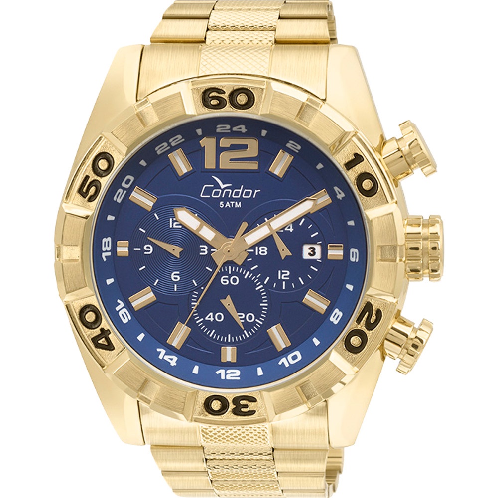 PRODUTO ORIGINAL GARANTIDO!!! Somos revendedores autorizados da marca Condor. *** Temos Disponivel, ENVIO IMEDIATO ! *** Relogio Condor COVD33AA/4A Informacoes Basicas - Marca: Condor - Referencia: COVD33AA/4A - Genero: Masculino - Garantia: 1 Ano diretamente com o fabricante Funcoes: - Analogico - Calendario - Cronografo Caracteristicas - Composicao do Vidro: Cristal mineral - Material da Caixa: Metal - Cor da Caixa: Dourado - Material da pulseira: Aco - Cor da Pulseira: Dourado - Bateria Descricao: Relogio Condor masculino com caixa e pulseira dourado. O reconhecido modelo Big Case possui caixa robusta e ganha forca com o banho dourado e mostrador azul, ideal para homens com personalidade e que desejam se destacar Medidas -Diametro da Caixa: 5,0 cm Resistencia a Agua 5 ATM - WR: 50 Mts - Pode Lavar as Maos: SIM - Pode Usar em Agua Corrente: SIM - Pode Usar na Piscina: SIM - Pode Usar em Mergulho Profundo: NAO Acompanha: - Manual de instrucoes - Embalagem - Certificado de Garantia -Nota Fiscal Ainda esta com duvida? Entre em contato conosco atraves do canal de perguntas, atendimento diario, respostas rapidas e estaremos sempre a disposicao para lhe atender.