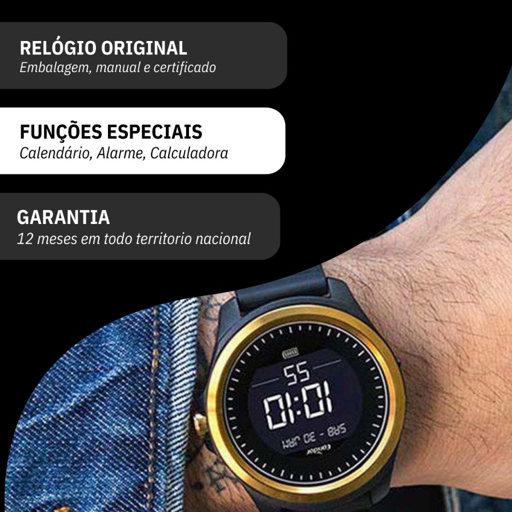 Você está procurando um relógio de sofisticado de resina para acompanhar o seu dia a dia? Seja bem vindo à RBM WEBSHOP - todos os nossos relógios são originais e a pronta entrega para envio imediato. Veja as PRINCIPAIS CARACTERÍSTICAS do Relógio Casio Digital Masculino Informações Básicas Marca: CONDOR Referencia: COKW05CAA/8D Gênero: Masculino Características Composição do Vidro: Acrílico Material da Caixa: Poliuretano Material da Pulseira: Silicone Mecanismo: Digital Alimentação: Bateria Resistência à Água: 3atm – 30mts: Pode tomar uma chuva e lavar as mãos Espessura: 1,4 cm Tamanho da Caixa: 4,8 cm (GRANDE) Diâmetro máximo da pulseira: 23 cm Peso: 48 g Fecho: Fecho Fivela (Buckle) Tampa posterior: Poliuretano, parafusado Funções Especiais Calendário Digital Cronômetro Digital Um Alarme Diário Cores Mostrador: Preto Caixa: Preto (Bisel dourado) Pulseira: Preto Conteúdo da Embalagem O relógio vai na caixa original, com cabo USB, com a nota fiscal, certificado de garantia e manual de instrução. 1 ano de garantia direto com o fabricante. VAMOS CONHECER MELHOR SOBRE A LOJA RBM WEBSHOP RELOGIOS? Somos uma das melhores e maiores lojas de relogios no Brasil. Todos os relógios vendidos pela nossa loja são 100% originais, contém nota fiscal, certificado, manual de instruções e garantia de 12 meses com a rede de assistência em todo o Brasil. Dúvidas? Pergunte, e será um enorme prazer lhe atender!