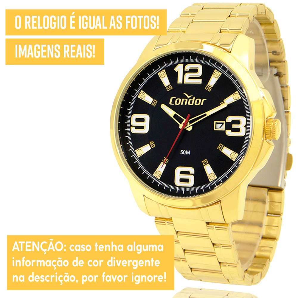 Procurando por uma joia cheia de estilo, tecnologia e que dure a vida inteira? Encontrou! Dê o incrível relógio Condor de presente para você mesmo ou para alguém querido! *1 ANO DE GARANTIA CONDOR - Produto com NOTA FISCAL* Atuamos somente com produtos 100% ORIGINAIS! Leve em um especialista de sua região para comprovar. Ficha Técnica RESISTENTE A ÁGUA: Sim – selo de resistência 5 ATM (resistência até 50 metros de profundidade) COR: Dourado MATERIAL DO VIDRO: Cristal mineral resistente a riscos MAQUINÁRIO: Analógico MATERIAL DO RELÓGIO: Liga de aço. Medidas TAMANHO DA CAIXA (mostrador): 4,5 cm (45 mm) ESPESSURA DA CAIXA (mostrador): 0,8 cm (8 mm) LARGURA DA PULSEIRA: 1,9 cm (19 mm) CIRCUNFERÊNCIA DA PULSEIRA: 27 cm Funções Calendário Ponteiros Fosforescentes Acompanha Relógio Condor, caixa original Condor, manual de instruções em português, certificado de garantia e nota fiscal. Nossos produtos são todos tratados com máximo cuidado, profissionalismo e atenção. Enviamos o seu relógio em uma embalagem reforçada, protegida por dentro e por fora. COMPRE COM SEGURANÇA Revendedor autorizado Condor.