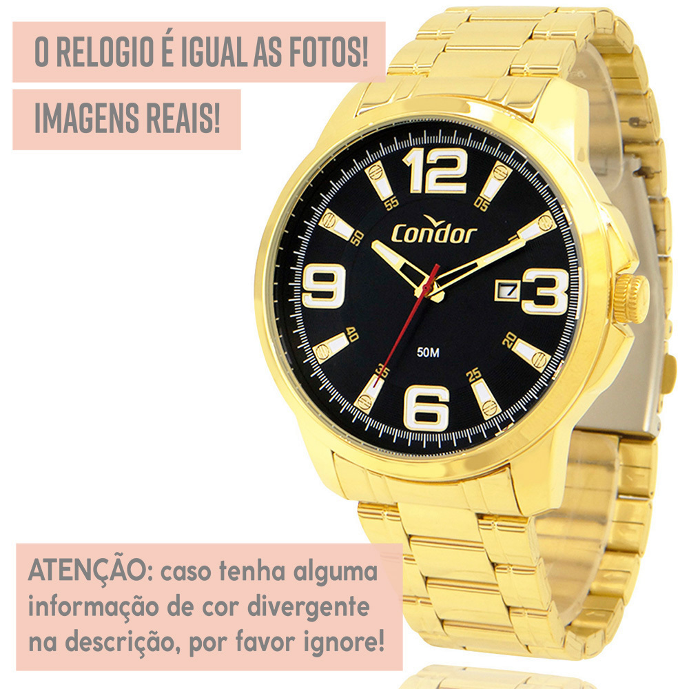 Procurando por uma joia cheia de estilo, tecnologia e que dure a vida inteira? Encontrou! Dê o incrível relógio Condor de presente para você mesmo ou para alguém querido! *1 ANO DE GARANTIA CONDOR - Produto com NOTA FISCAL* Atuamos somente com produtos 100% ORIGINAIS! Leve em um especialista de sua região para comprovar. Ficha Técnica RESISTENTE A ÁGUA: Sim – selo de resistência 5 ATM (resistência até 50 metros de profundidade) COR: Dourado MATERIAL DO VIDRO: Cristal mineral resistente a riscos MAQUINÁRIO: Analógico MATERIAL DO RELÓGIO: Liga de aço. Medidas TAMANHO DA CAIXA (mostrador): 4,5 cm (45 mm) ESPESSURA DA CAIXA (mostrador): 0,8 cm (8 mm) LARGURA DA PULSEIRA: 1,9 cm (19 mm) CIRCUNFERÊNCIA DA PULSEIRA: 27 cm Funções Calendário Ponteiros Fosforescentes Acompanha Relógio Condor, caixa original Condor, manual de instruções em português, certificado de garantia e nota fiscal. Nossos produtos são todos tratados com máximo cuidado, profissionalismo e atenção. Enviamos o seu relógio em uma embalagem reforçada, protegida por dentro e por fora. COMPRE COM SEGURANÇA Revendedor autorizado Condor.