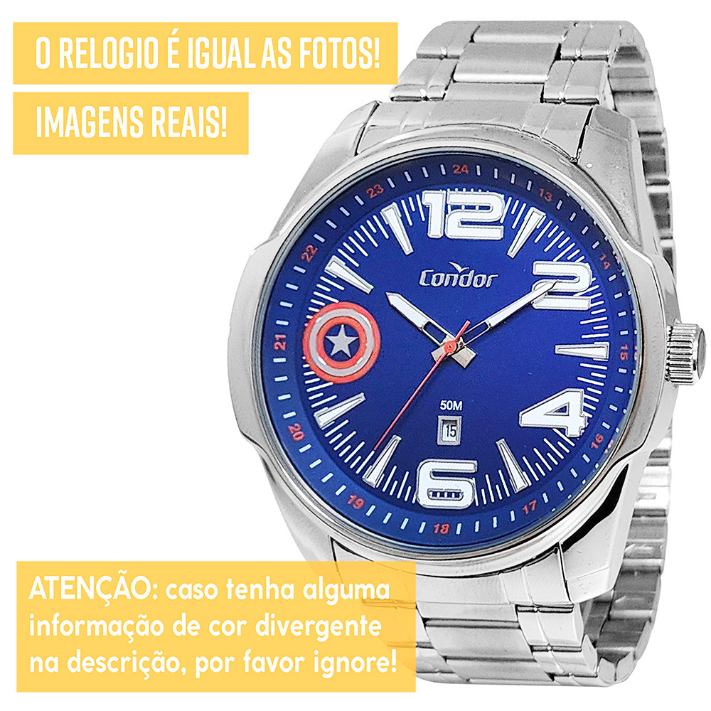 Procurando por uma joia cheia de estilo, tecnologia e que dure a vida inteira? Encontrou! Dê o incrível relógio Condor de presente para você mesmo ou para alguém querido. *1 ANO DE GARANTIA CONDOR - Produto original com NOTA FISCAL* *ACOMPANHA PULSEIRA CONDOR* Atuamos somente com produtos 100% ORIGINAIS! Leve em um especialista de sua região para comprovar. Ficha Técnica RESISTENTE A ÁGUA: Sim - selo de resistência 5 ATM (resistência até 50 metros de pressão atmosférica) MATERIAL DO VIDRO: Cristal mineral resistente a riscos MAQUINÁRIO: Analógico - Quartzo - bateria MATERIAL DO RELÓGIO: Aço inoxidável COR DO FUNDO: Azul Medidas TAMANHO DA CAIXA (mostrador): 5,3 cm (53 mm) ESPESSURA DA CAIXA (mostrador): 1,1 cm (11 mm) LARGURA DA PULSEIRA: 2,4 cm (24 mm) CIRCUNFERÊNCIA DA PULSEIRA: 25 cm (pode ser diminuída para servir em todo tipo de pulso) Funções Calendário Ponteiros fosforescentes Acompanha Relógio Condor, pulseira condor, caixa original Condor, manual de instruções em português, certificado de garantia e nota fiscal. Nossos produtos são todos tratados com máximo cuidado, profissionalismo e atenção. Enviamos o seu relógio em uma embalagem reforçada, protegida por dentro e por fora. Caso não tenha gostado ou simplesmente se arrependeu, devolva o produto sem preocupações. Você tem 30 dias a partir do recebimento para devolvê-lo. COMPRE COM SEGURANÇA Revendedor autorizado Condor