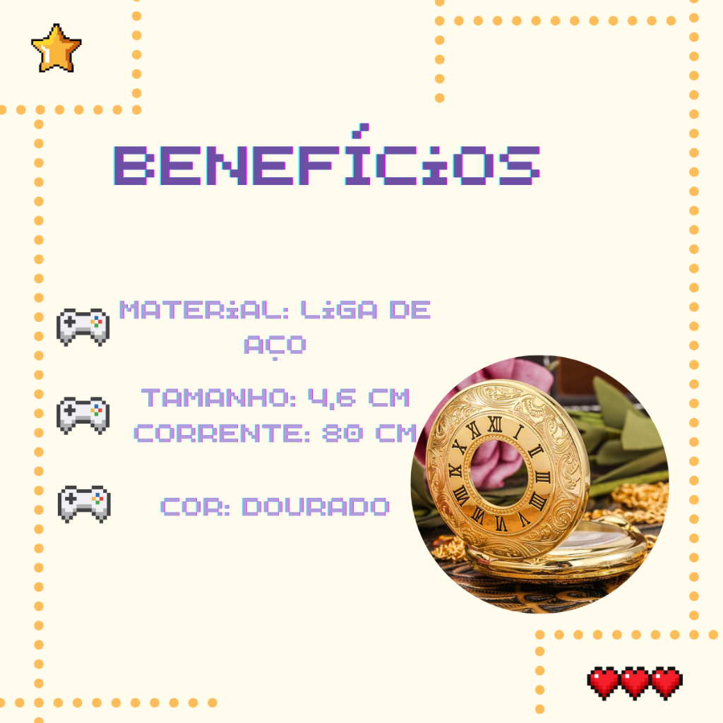 Elegância e estilo em um único acessório! O relógio de bolso steampunk dourado é perfeito para quem aprecia um visual clássico e sofisticado. Com design retrô inspirado na era vitoriana, ele combina charme e funcionalidade, sendo ideal para uso pessoal ou como presente especial. Fabricado com materiais de qualidade e acabamento detalhado, é uma peça que se destaca em qualquer ocasião. O QUE VOCÊ IRÁ RECEBER 01 Relógio de bolso dourado estilo vintage 01 Corrente resistente para transporte 01 Bateria extra para reposição BENEFÍCIOS DESIGN ELEGANTE E RETRÔ QUE CHAMA ATENÇÃO MATERIAL RESISTENTE E DURÁVEL FUNCIONAMENTO PRECISO COM MECANISMO QUARTZO IDEAL PARA PRESENTEAR OU COLECIONAR CARACTERÍSTICAS Material: Aço inoxidável e mostrador em acrílico Cor: Dourado (Gold) Diâmetro aproximado: 4,6 cm Comprimento da corrente: 80 cm PERGUNTAS FREQUENTES O produto está disponível à pronta entrega? Sim, todos os nossos produtos estão disponíveis para envio imediato. Em quanto tempo o pedido é enviado? Após a confirmação do pagamento, o envio é realizado em até 24 horas úteis. O relógio funciona com bateria? Sim, o funcionamento é à bateria e acompanha uma unidade extra. Tem garantia? Sim, o produto possui garantia contra defeitos de fabricação e suporte pós-venda para qualquer necessidade. palavras-chave: relógio de bolso, steampunk, retro, vintage, antigo, relíquia, numeros romanos, antigo, com corrente, vitoriano