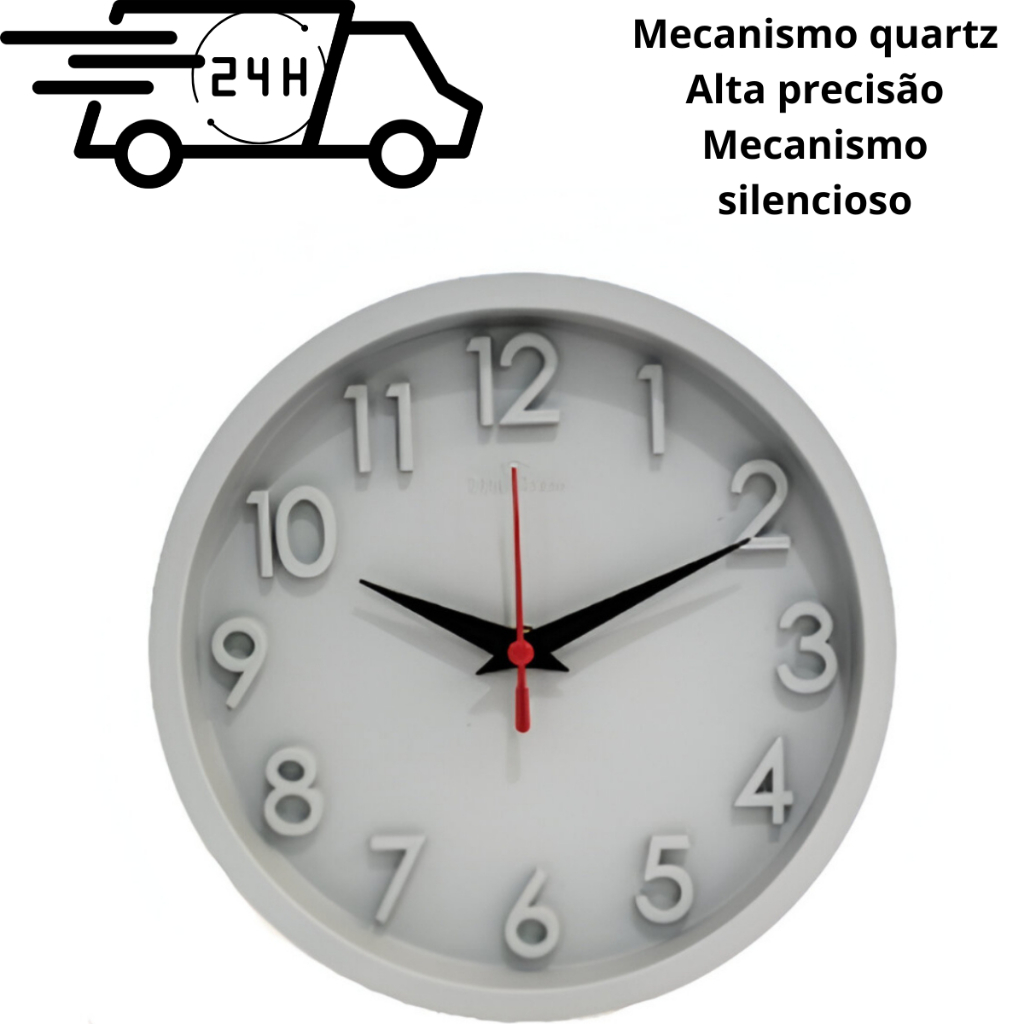 Instruções de Uso: Coloque uma pilha AA no compartimento (2) observando corretamente o lado + e - conforme desenho acima. Ajuste o horário girando o botão (1) em sentido horário até obter a marcação desejada. Para maior durabilidade retire a pilha quando for ficar ausente por um período longo. Cuidados e Conservação: Expor a luz solar poderá causar danos a seu relógio. Para a limpeza utilizar apenas pano úmido e detergente neutro. O relógio não é a prova d'água. Não usar produtos abrasivos. Evitar quedas. Não ficar em locais com alta temperatura e umidade. Especificações Técnicas: Composição: Plástico (Polipropileno e Poliestireno). Sem lente acrílica Alimentação: Uma pilha AA 1.5V (Não inclusa). Validade: Indeterminado Dimensional: 24x24x5cm Contém: 1 Peça Indústria Brasileira