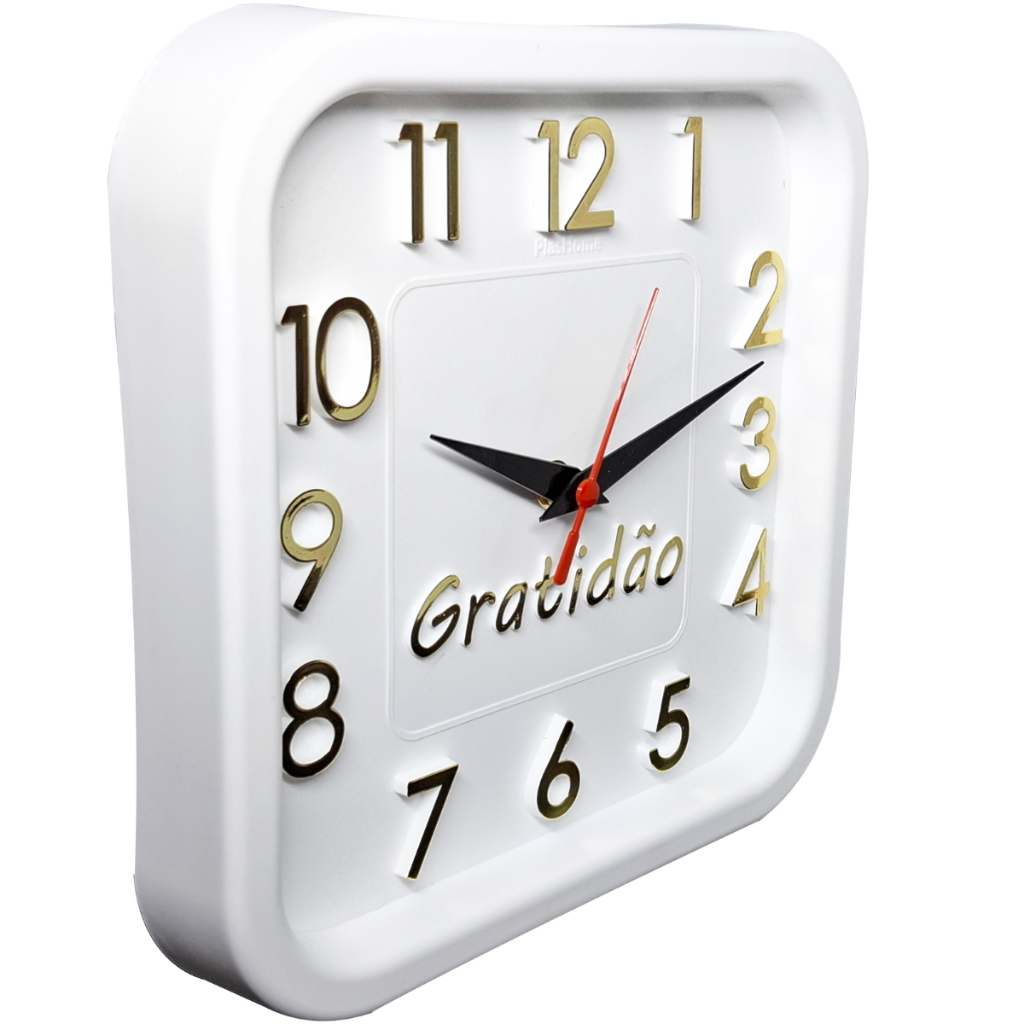 Relógio de Parede Branco com Dourado Sigma Quadrado Gratidão 24 cm Silencioso Decoração Sala Cozinha Escritório