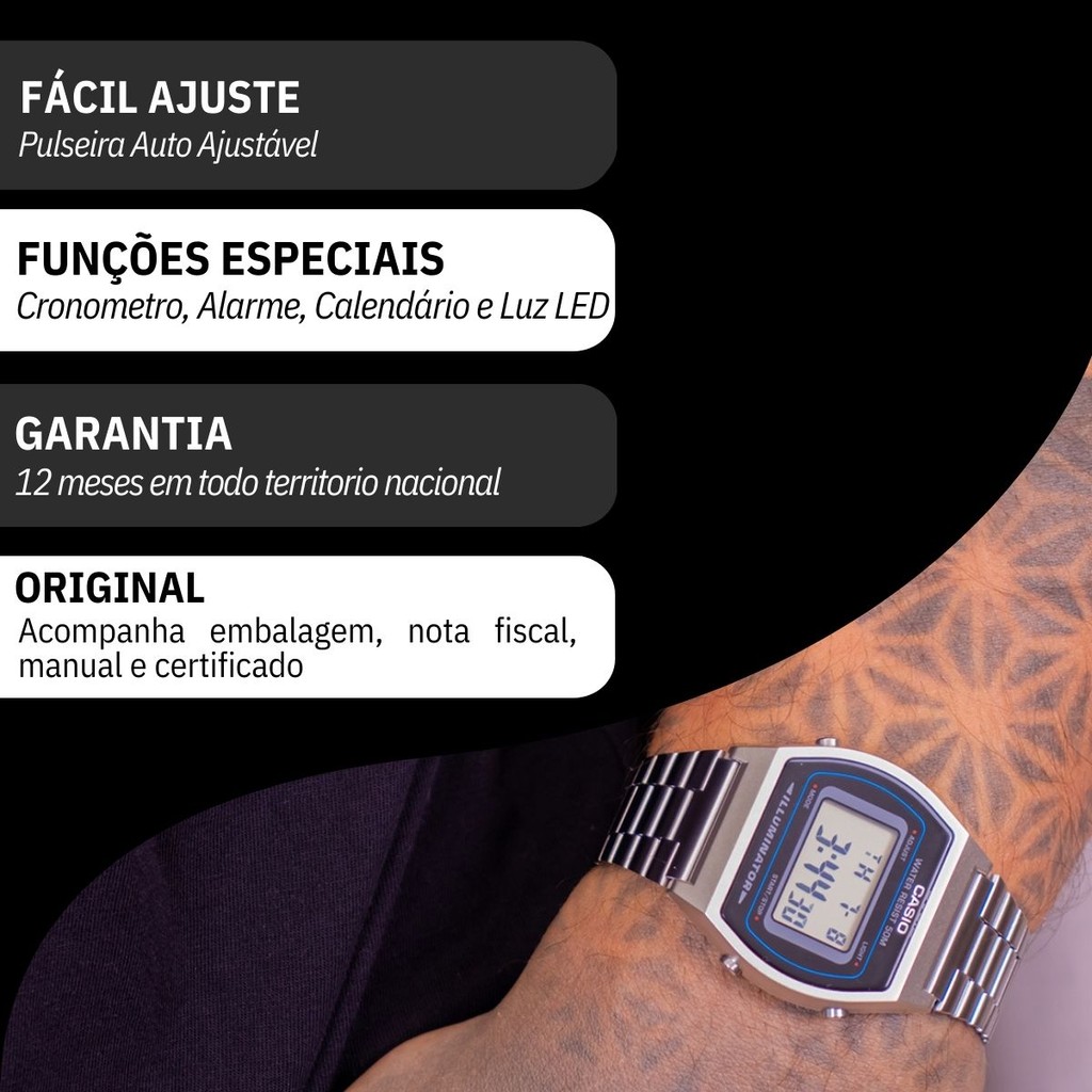 Você está procurando um relógio vintage para acompanhar o seu dia a dia? Seja bem vindo à RBM WEBSHOP - todos os nossos relógios são originais e a pronta entrega para envio imediato. Veja as PRINCIPAIS CARACTERÍSTICAS do Relógio Casio Digital Vintage Informações Básicas Marca: Casio Modelo: B640WD-1AVDF Gênero: Unissex Resistência à Água: 3atm – 30mts: Pode tomar uma chuva e lavar as mãos Medidas do Relógio Tamanho: 33.5 × 28.6 × 8.6 mm (PEQUENO) Circunferência da pulseira e tamanho máximo de ajuste de punho: 20 cm Espessura: 0,9 cm Peso: 36 gramas Materiais do Relógio Composição do Vidro: Cristal Mineral (RESISTENTE A RISCOS) Material da Caixa: Vidro com Resina Cromado Material da Pulseira: Aço Inox Material da Tampa: Aço Inox Características do Relógio Mecanismo: Digital Alimentação: Bateria Duração aproximada da bateria: 3 anos Fecho: Ajustável Tampa Posterior: Parafusado Funções Especiais Cronômetro Cronômetro de 1/100 de segundo Capacidade de medição: 00'00"00~59'59"99 (nos primeiros 60 minutos) 1:00'00~23:59'59 (após 60 minutos) Unidade de medição: 1/100 de segundo (nos primeiros 60 minutos) 1 segundo (após 60 minutos) Modos de medição: Tempo decorrido, tempo parcial, tempos do 1º e 2º lugares contagem regressiva Timer de contagem regressiva Unidade de medição: 1 segundo Intervalo de contagem regressiva: 24 horas Intervalo de ajuste da hora de início da contagem regressiva: de 1 segundo a 24 horas (incrementos de 1 segundo, incrementos de 1 minuto e incrementos de 1 hora) Outros: Repetição automática Alarme / Sinalização Sinalização a cada hora Alarmes multifuncionais Recurso de alerta piscante Alerta piscante Pisca e soa para alarmes, sinalização a cada hora Luz Fosforescência de luz de fundo de LED Cor da luz LED: laranja Calendário Calendário automático completo (até o ano de 2039) Precisão Precisão: ±30 segundos por mês Outros recursos Formatos de 12/24 horas Indicação das horas regular: Hora, minuto, segundo, pm, mês, data, dia Cores Mostrador: Digital Caixa: Prata Pulseira: Prata Garantia 1 ano de garantia em todo território nacional com a rede autorizada Conteúdo da Embalagem Este produto acompanha Manual em Português e Nota Fiscal, Embalagem de Fabrica Original e Garantia Nacional do Fabricante. VAMOS CONHECER MELHOR SOBRE A LOJA RBM WEBSHOP RELOGIOS? Somos uma das melhores e maiores lojas de relogios no Brasil. Todos os relógios vendidos pela nossa loja são 100% originais, contém nota fiscal, certificado, manual de instruções e garantia de 12 meses com a rede de assistência em todo o Brasil. Dúvidas? Pergunte, e será um enorme prazer lhe atender!