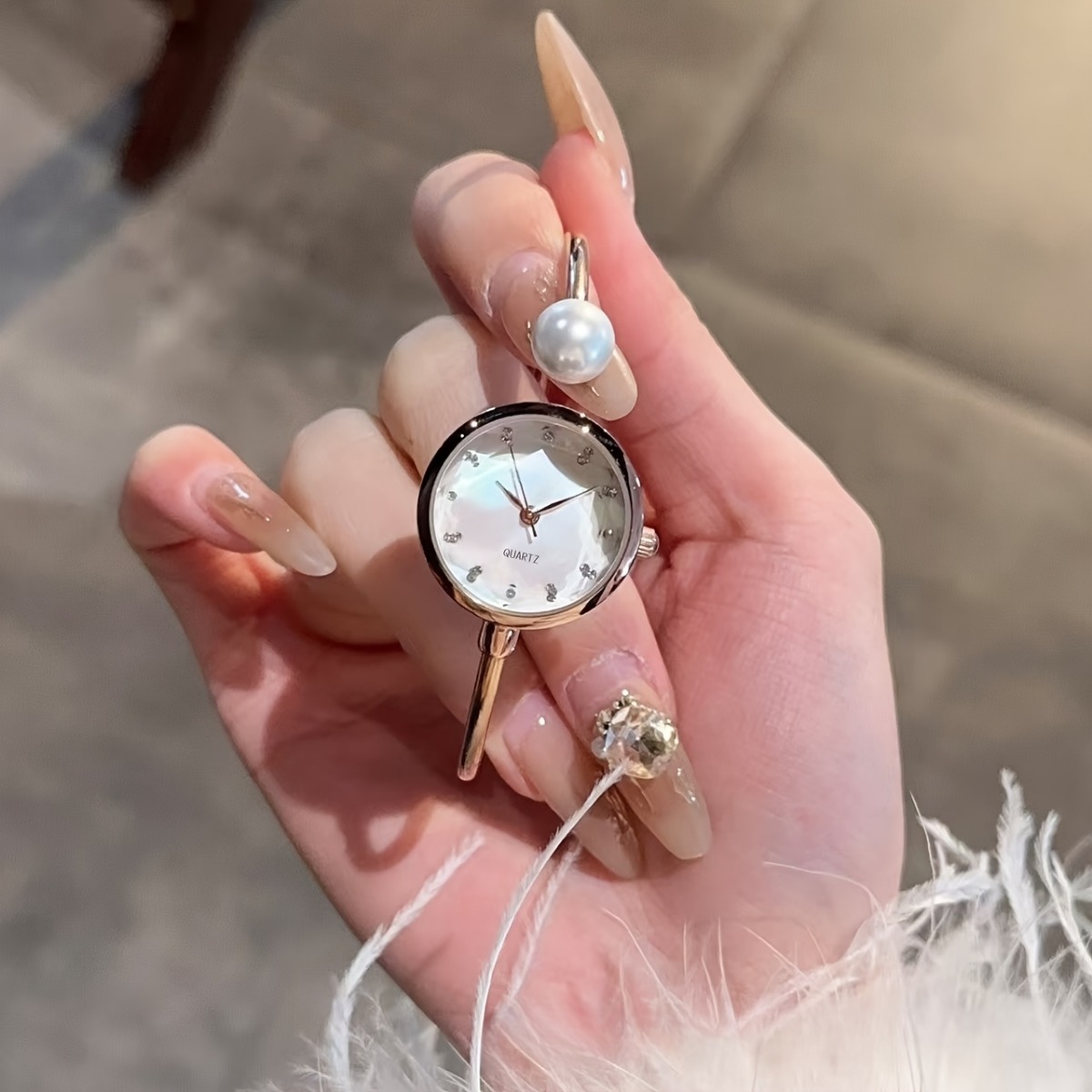 Relógio de pulso elegante com pulseira de pérola e mostrador com diamantes
