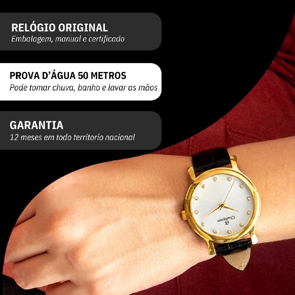 Você está procurando um relógio analógico feminino elegante e sofisticado para acompanhar o seu dia a dia? Seja bem vindo à RBM WEBSHOP - todos os nossos relogios são originais e a pronta entrega para envio imediato. Veja as PRINCIPAIS CARACTERÍSTICAS do Relógio Feminino Champion Dourado Informações Básicas Marca: Champion Modelo: CH22733B Gênero: Feminino Resistência à Água: 5atm – 50mts: Pode ser usado para nadar, praticar esportes e lavar as mãos Medidas do Relógio Tamanho (DIÂMETRO): 4,0 cm (MÉDIO) Espessura: 1 cm Largura da Pulseira: 1,9 cm Circunferência da Pulseira: 19 cm Peso: 48 gramas Materiais do Relógio Composição do Vidro: Cristal Mineral (RESISTENTE A RISCOS) Material da Caixa: Metal Material da Pulseira: Sintético Material da Tampa: Aço Inox Características do Relógio Mecanismo: Quartz Alimentação: Bateria com vida útil aproximada 2 anos Fecho: Fecho Fivela (Buckle) Fundo: Rosca Cores Mostrador: Champagne Caixa: Dourado Pulseira: Preto Garantia 1 ano de garantia em todo território nacional com a rede autorizada Conteúdo da Embalagem O relógio vai na caixa original, colar e brincos, com a nota fiscal, certificado de garantia e manual de instrução. VAMOS CONHECER MELHOR SOBRE A LOJA RBM WEBSHOP RELOGIOS? Somos uma das melhores e maiores lojas de relogios no Brasil. Todos os relógios vendidos pela nossa loja são 100% originais, contém nota fiscal, certificado, manual de instruções e garantia de 12 meses com a rede de assistência em todo o Brasil. Dúvidas? Pergunte, e será um enorme prazer lhe atender!