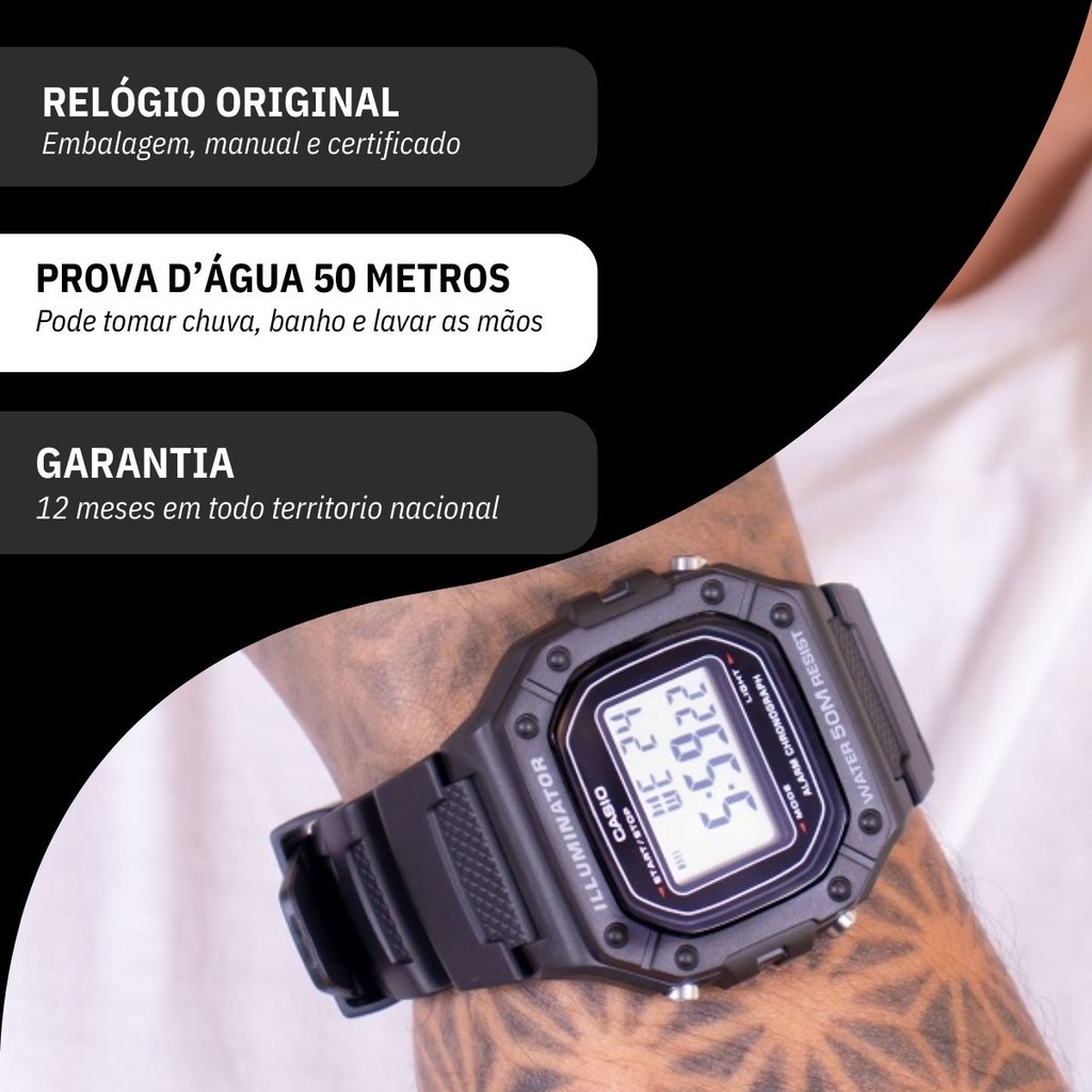 Você está procurando um relógio digital masculino para acompanhar o seu dia a dia? Seja bem vindo à RBM WEBSHOP - todos os nossos relogios são originais e a pronta entrega para envio imediato. Veja as PRINCIPAIS CARACTERÍSTICAS do Relógio Masculino Casio Digital Informações Básicas Marca: CASIO Modelo: W-218H-1AV Gênero: Masculino Resistência à Água: 5atm – 50mts: Pode ser usado para nadar, praticar esportes e lavar as mãos Medidas do Relógio Tamanho da Caixa (C x L x A): 44.4 x 43.2 x 10.8 mm (MÉDIO) Circunferência Máxima da Pulseira: 21 cm (DIÂMETRO MÁXIMO NO PULSO) Largura da Pulseira: 2,0 cm Peso: 37 gramas Materiais do Relógio Composição do Vidro: Resina (RESISTENTE A RISCOS) Material da Caixa: Resina Material da Pulseira: Resina Material da Tampa: Aço Inox Características do Relógio Mecanismo: Digital Alimentação: Bateria em CR2016 Duração aproximada da bateria: 7 anos Fecho: Fecho Fivela (Buckle) Fundo: Parafusado FUNÇÕES ESPECIAIS Cronômetro de 1/100 de segundo Capacidade de medição: 59'59,99" Modos de medição: tempo decorrido, tempo parcial, tempos do 1º e 2º lugares Alarme/sinalização a cada hora Alarme diário Sinalização a cada hora Luz de fundo de LED Cor da luz LED: Laranja Calendário automático (definido para 28 dias em fevereiro) Precisão: ±30 segundos por mês Formatos de 12/24 horas Modo de indicação das horas regular: hora, minuto, segundo, pm, data, dia Cores Mostrador: Digital Caixa: Preto Pulseira: Preto Garantia 1 ano de garantia em todo território nacional com a rede autorizada Conteúdo da Embalagem O relógio vai na caixa original, com a nota fiscal, certificado de garantia e manual de instrução. VAMOS CONHECER MELHOR SOBRE A LOJA RBM WEBSHOP RELOGIOS? Somos uma das melhores e maiores lojas de relogios no Brasil. Todos os relógios vendidos pela nossa loja são 100% originais, contém nota fiscal, certificado, manual de instruções e garantia de 12 meses com a rede de assistência em todo o Brasil. Dúvidas? Pergunte, e será um enorme prazer lhe atender!