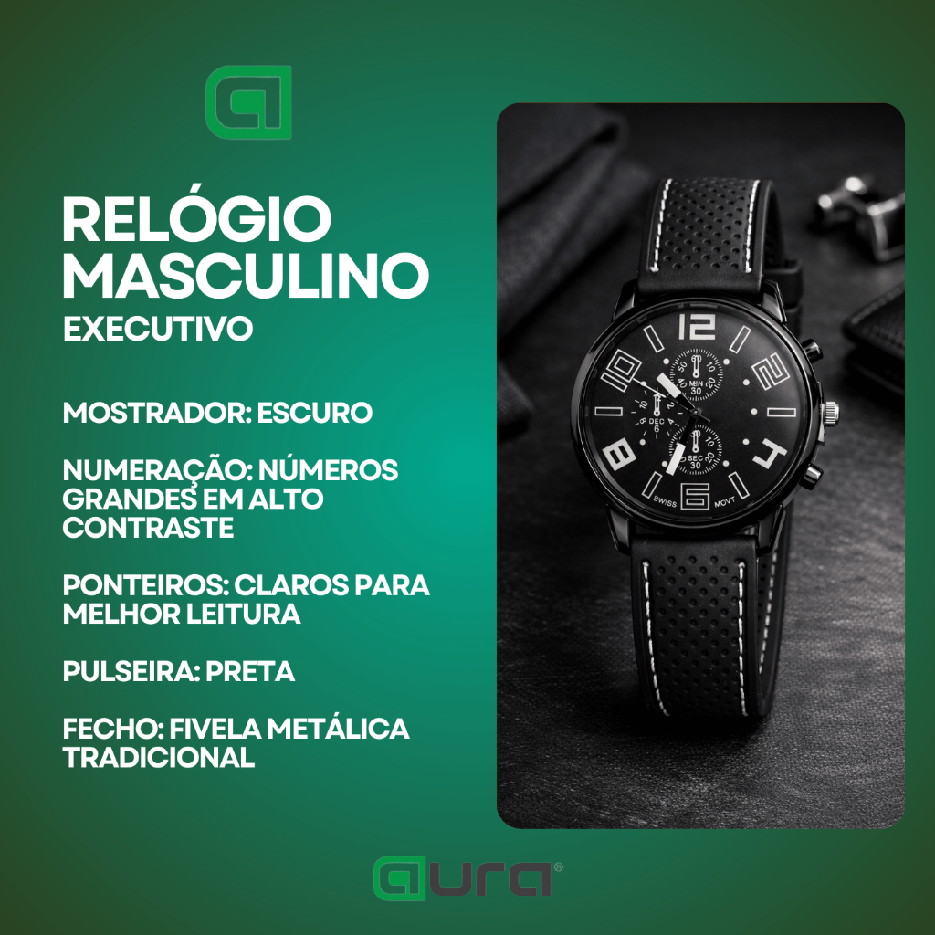 Relógio Masculino Analógico – Estilo Moderno e Versátil Um acessório que combina elegância e praticidade para o dia a dia. O visual escuro com contrastes claros cria uma aparência moderna, fácil de combinar tanto com roupas casuais quanto sociais, ideal para trabalho, encontros ou ocasiões especiais. O relógio possui caixa redonda preta com acabamento brilhante e mostrador escuro com números grandes de fácil leitura. Conta ainda com três submostradores visuais que reforçam o design sofisticado. A pulseira preta texturizada com perfurações e costuras aparentes traz um toque esportivo, enquanto a fivela metálica garante ajuste tradicional e seguro. No pulso apresenta proporção equilibrada, oferecendo conforto e presença sem exageros — perfeito para quem busca um relógio discreto, porém marcante. Características: • Estilo: Casual / Social moderno • Formato da caixa: Redonda • Cor: Preto • Mostrador: Escuro com numeração destacada • Submostradores: 3 visuais • Pulseira: Preta texturizada com costura lateral • Fecho: Fivela metálica • Leitura: Analógica • Indicação de uso: Dia a dia, trabalho e ocasiões sociais Uma escolha prática para quem quer um relógio elegante, confortável e fácil de combinar em qualquer situação.