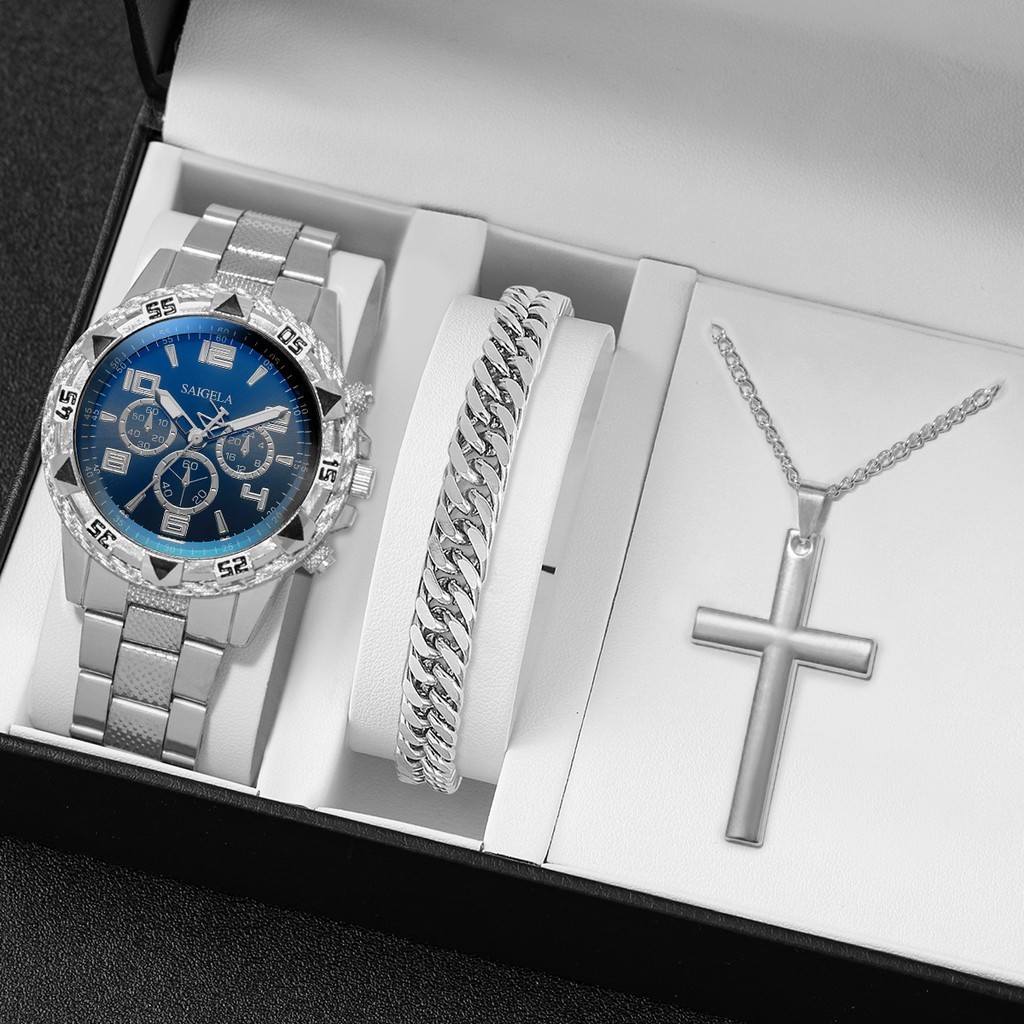 Relógio De Quartzo De Aço Masculino E Conjunto De Cruz Dourada , Joias Casuais De Negócios , Combinação De Presente De L