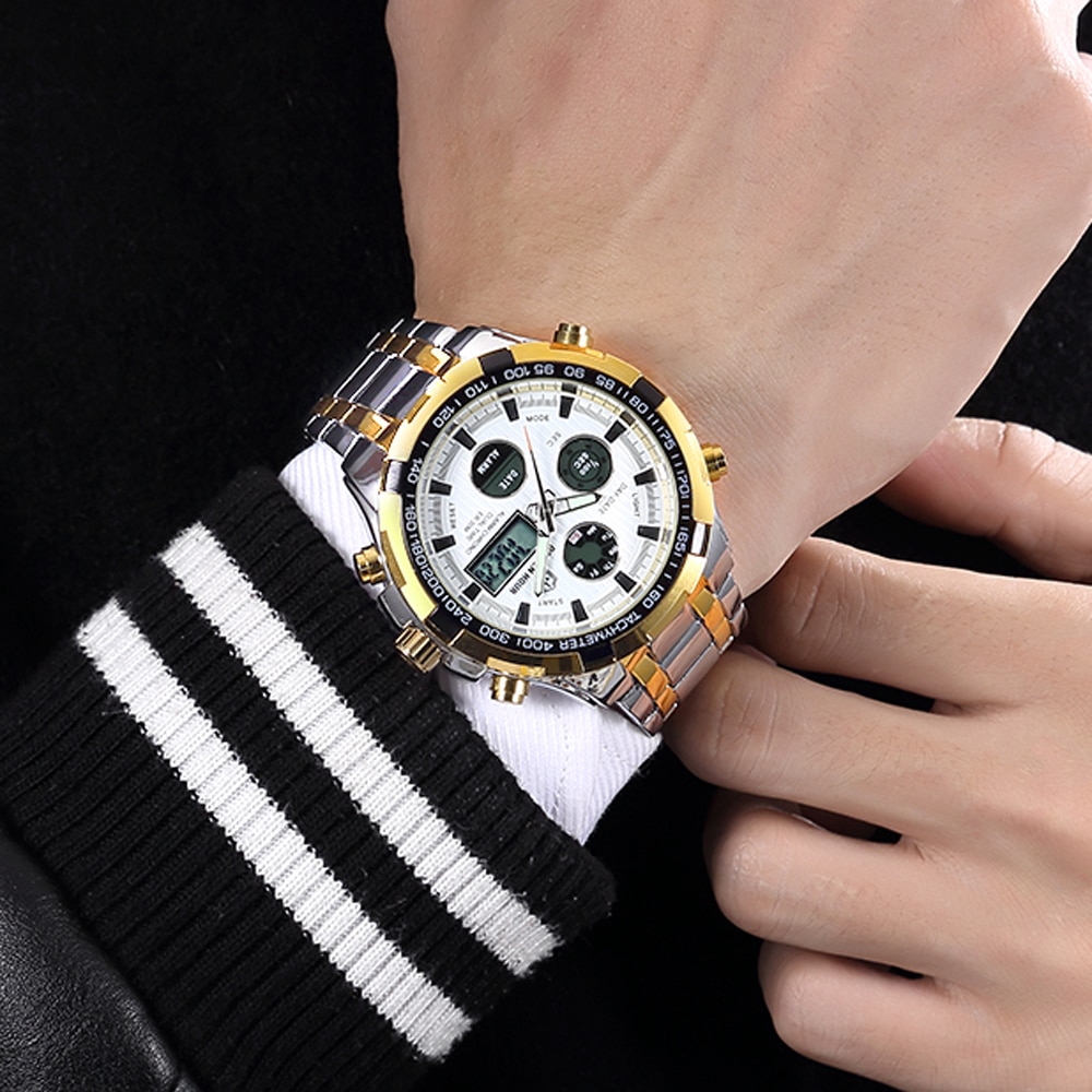 Relógio de Quartzo GOLDENHOUR com Visor Duplo de Aço Inox à Prova d’Água Masculino / Relógio de Pulso Executivo/Luxuoso