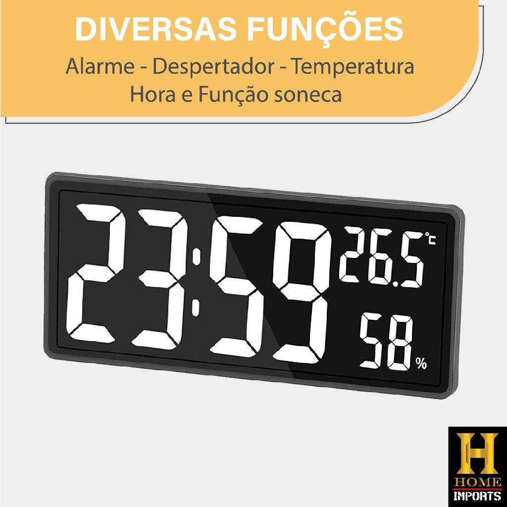 OFERTA POR TEMPO LIMITADO, APROVEITE!! ENVIO IMEDIATO PARA TODO BRASIL! CONHEÇA NOSSA LINHA DE PRODUTOS, ADICIONE NA MESMA COMPRA E ECONOMIZE NO FRETE.. Relógio LED Digital Com Despertador, Alarme, Temperatura, Umidade Relativa do Ar e Controle De Luminosidade. Relógio Digital de LED em formato de televisão espelhado, discreto e ao mesmo tempo luxuoso. Conta com varias funções, dentre elas escolher entre temperatura CELSIUS ou FAHRENHEIT, três tonalidades diferentes , desde a mais clarinha até a mais intensa, exibição de horas em 12 horas ou 24 horas, Umidade relativa do ar na porcentagem correta. Pode ser usado com pilhas AAA (palito) ou ligado diretamente no cabo de energia de entrada USB. Design sofisticado de estilo EUROPEU, item decorativo de alto padrão para sua casa ou escritório... - LED: não só elegante, mas também prático. - Feito de material plástico ABS de alta qualidade, o relógio é leve e elegante; tela LED larga e brilhante. - Design criativo, versatilidade e qualidade confiável. - Dois Modos de exibição das horas 12 horas / 24 horas. - Dois modos de temperatura: graus. C / grau. F. - Fonte de alimentação: Cabo USB ou PILHAS AAA. - Despertador. - Pode ser usado apenas UM ALARME POR DIA. - Umidade relativa do ar. - Tamanho: 23 cm x 7 cm x 4 cm. - Peso: 300 Gramas. ITENS NA EMBALAGEM DO PRODUTO: - 1 Relógio Led Digital Com Despertador. - 1 Cabo USB. - 1 Manual de Instruções. **** O RELÓGIO SÓ FUNCIONA LIGADO A UMA FONTE DE ENERGIA, OU A PILHA, NÃO POSSUINDO BATERIA INTERNA EM CASO DE QUEDA DE ENERGIA***** TIRE SUAS DUVIDAS CONOSCO ATRAVÉS DO CHAT OU DE NOSSOS CANAIS DE ATENDIMENTO EXCLUSIVOS, SERÁ UM PRAZER TE ATENDER. Somos especialistas em produtos PREMIUM! Para que você nosso cliente, tenha produtos de altíssima qualidade pelo MENOR PREÇO! ENVIO IMEDIATO PARA TODO BRASIL !! ATENÇÃO POUCAS UNIDADES EM ESTOQUE, COMPRE AGORA E GARANTA O MELHOR PREÇO. OFERTA POR TEMPO LIMITADO!! A HOME IMPORTS atua no mercado físico a mais de 30 anos e possuímos uma vasta experiência em produtos PREMIUM, nosso maior objetivo é trazer seriedade e honestidade, proporcionando para você cliente, uma segurança em adquirir nossos produtos. Todos os nossos produtos acompanha NOTA FISCAL e GARANTIA, enviamos seu pedido em TEMPO RECORDE.